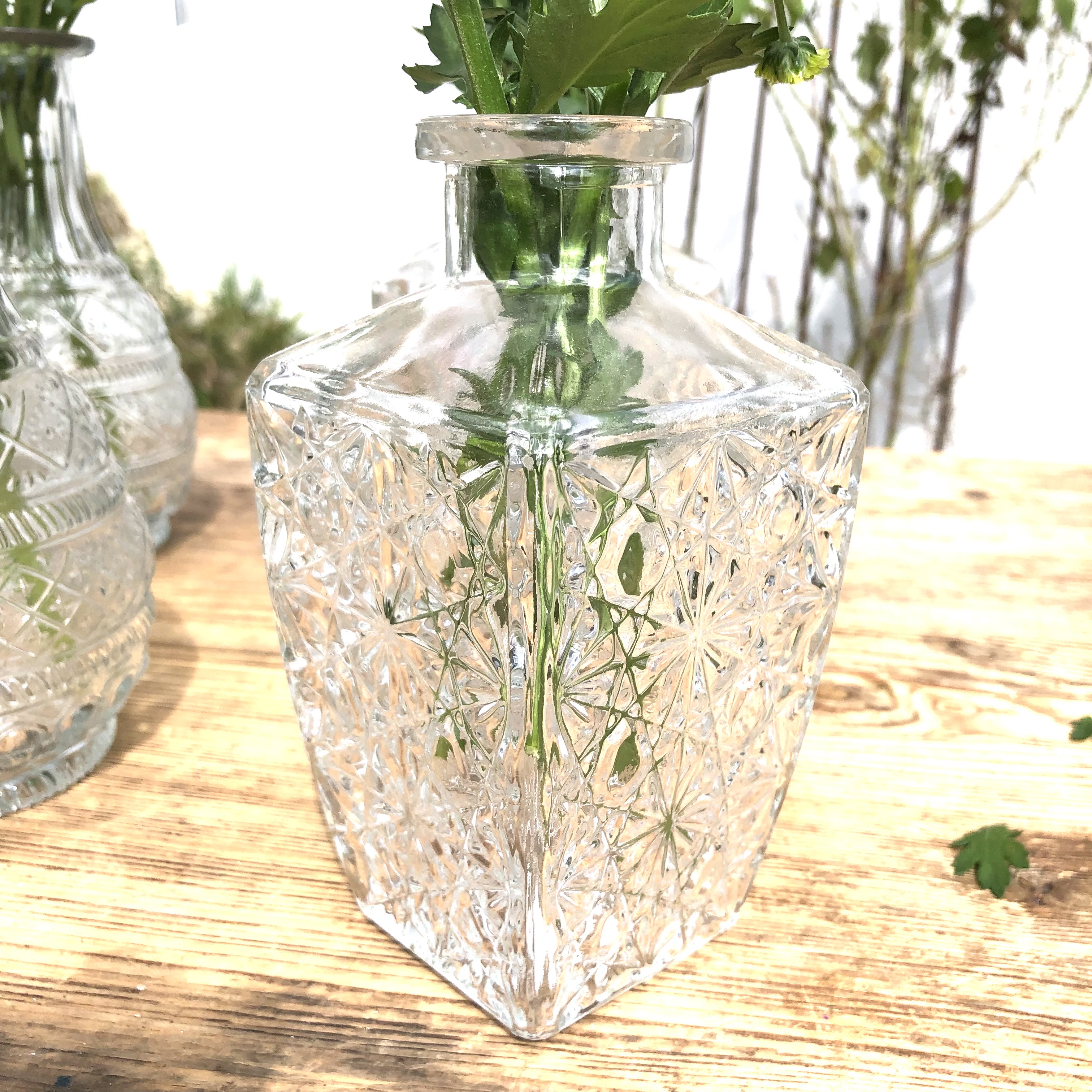 Stilvolle Vasen aus Glas im bezaubernden Vintage-Look mit außergewöhnlich schönen Formen und Mustern. Mit ein oder zwei Blüten und etwas Gras oder Schleierkraut werden diese Tischvasen zum dekorativen Blickfang. Die kleinere Variante der Glasvasen hat eine Höhe von 12 - 14 cm, die größere Variante der Blumenvasen sind zwischen 14,8 bis 20 cm hoch.