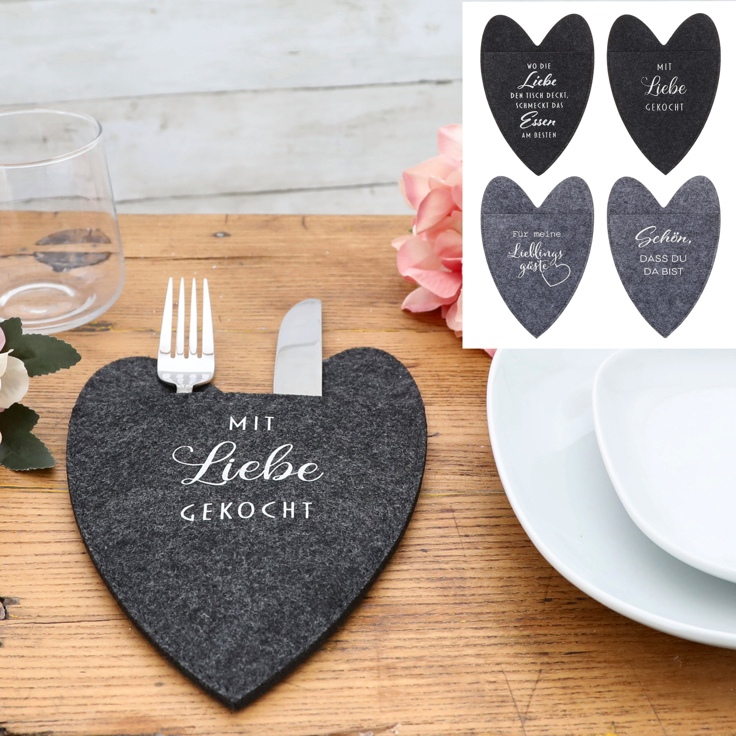 6 x Bestecktasche aus Filz in Herz- oder rechteckiger Form mit Spruch 15 x 23 cm