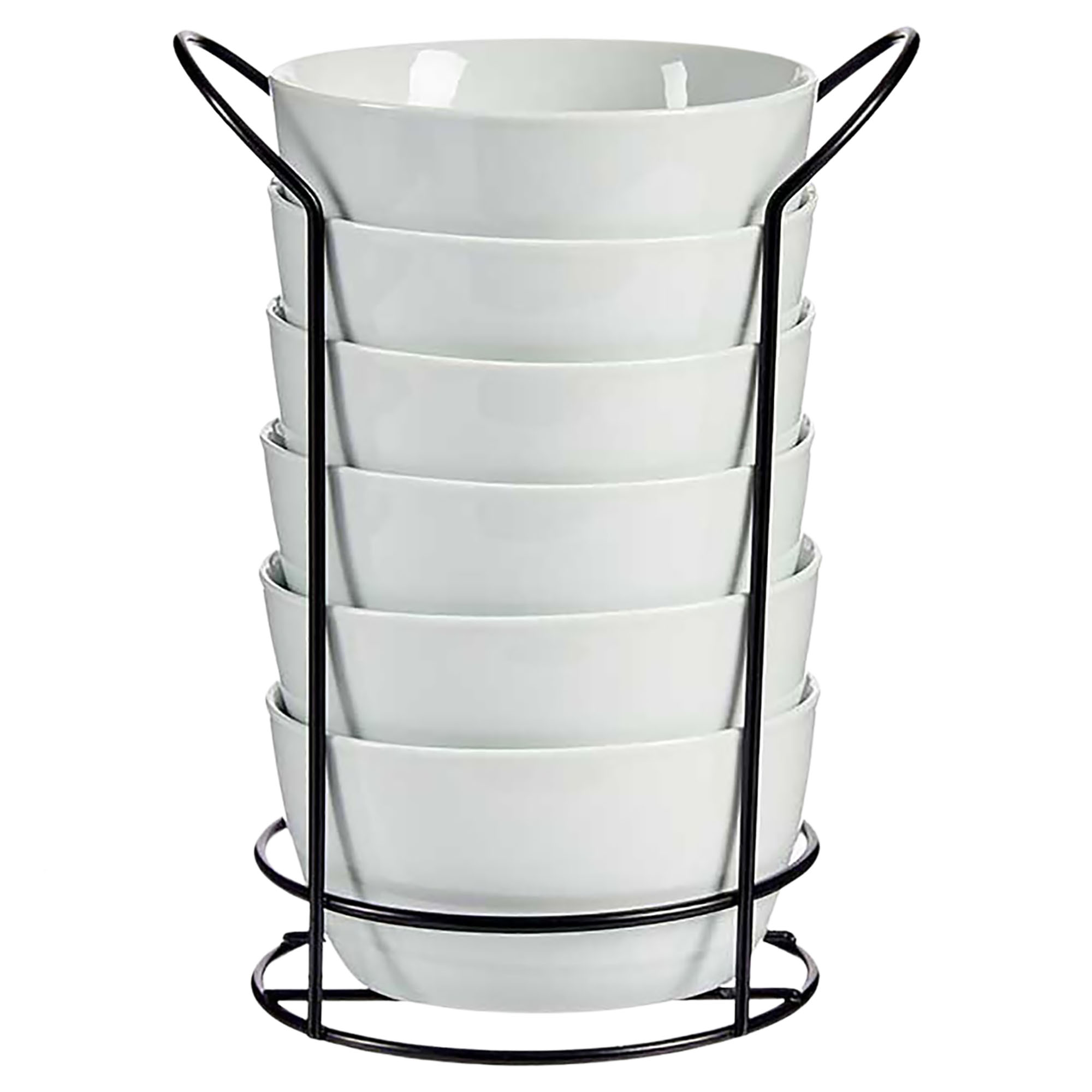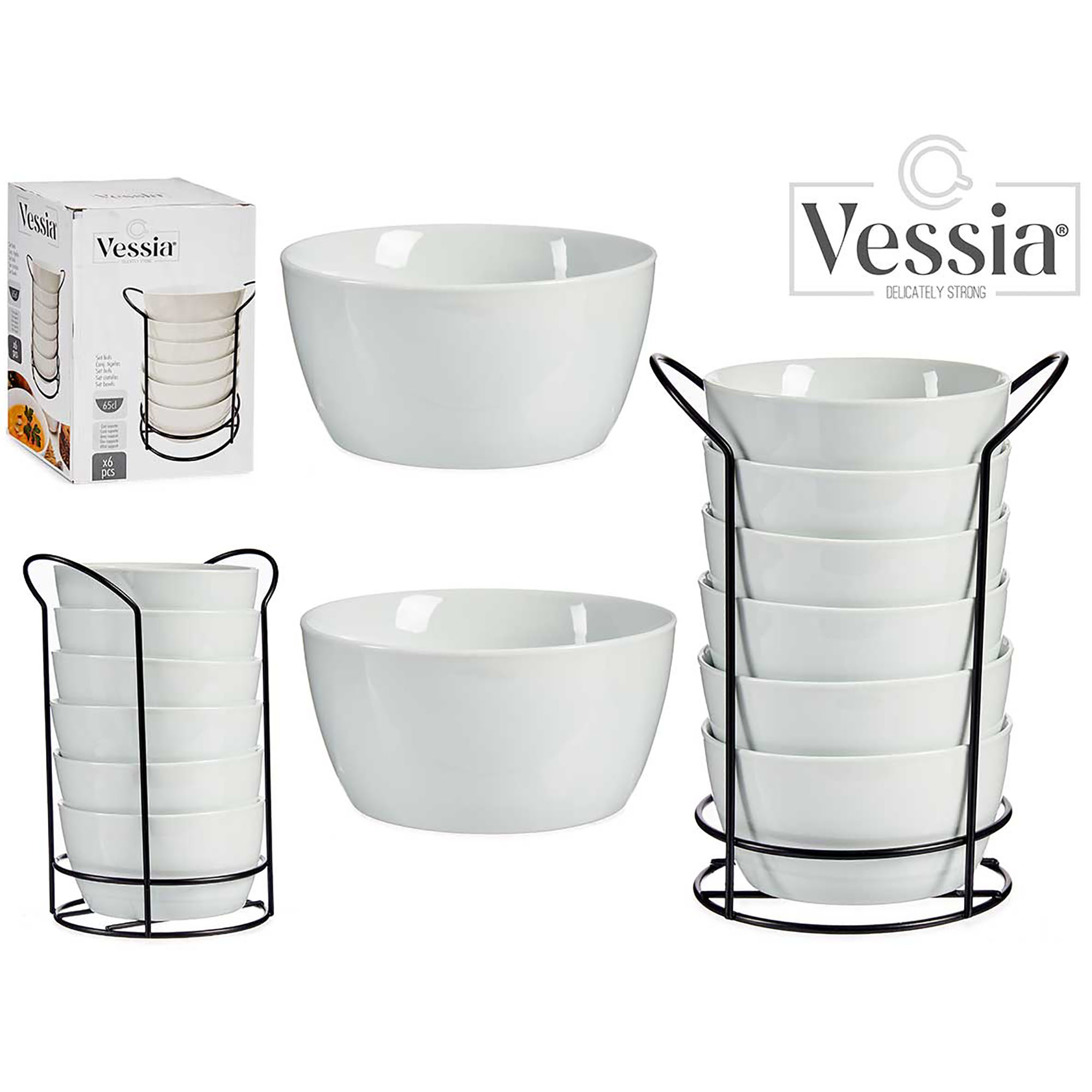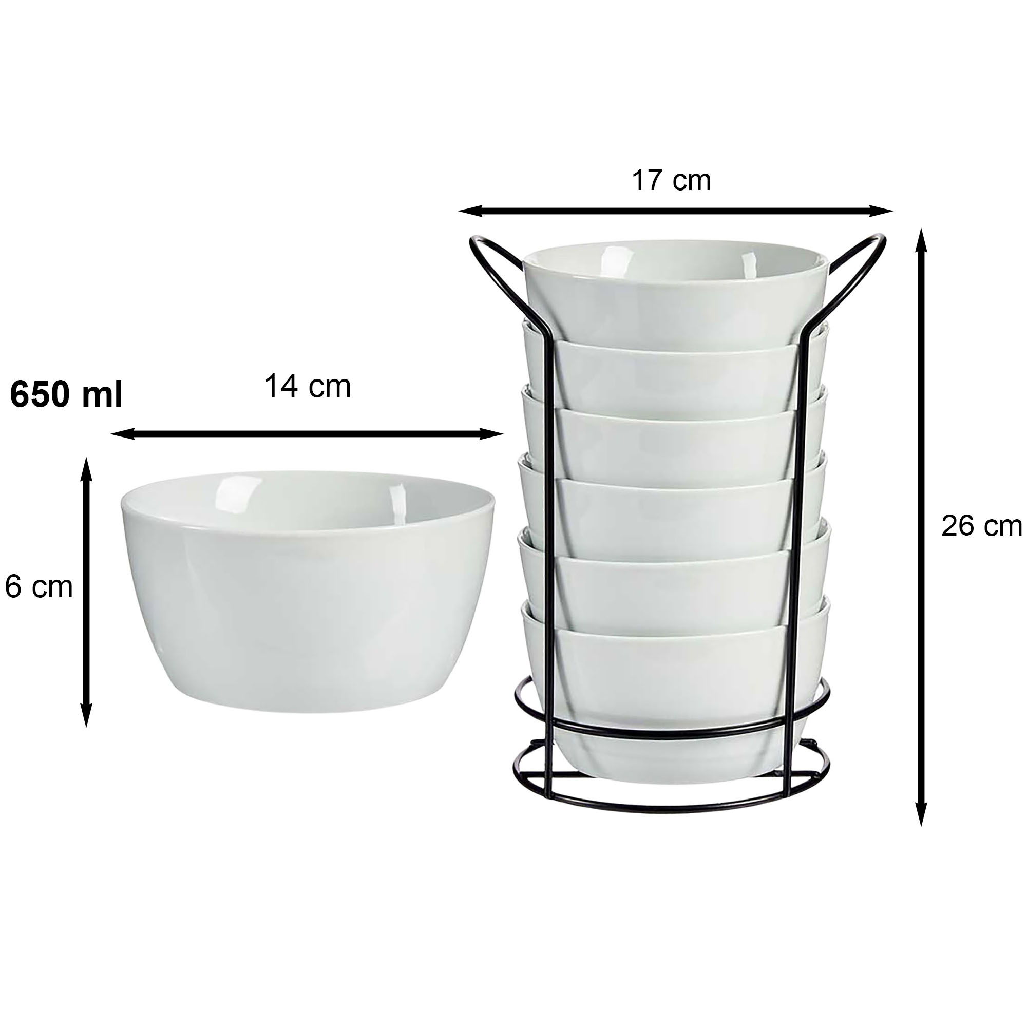Sechs Schalen aus weißem Porzellan in verschiedenen Größen und Formen erhältlich. Aufgrund der neutralen Farbe sind die Servierschalen mit vielen Geschirren kombinierbar. Aufgrund Ihrer kompakten Größe eignen sich die Porzellanschalen für Müsli, Salat, Suppen, Eintopf, Desserts oder Creme Brulee. Für unzählige Einsatzmöglichkeiten ideal, die Schüssel-Sets machen in jeder Küche ein gute Figur! Manche der Porzellan-Sets beinhalten auch einen dekorativen Metallständer, so können die Schalen in einer offenen Küche toll in Szene gesetzt werden.