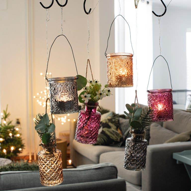 Stilvolle kleine Windlichter mit Henkel und ausgefallener Glasmusterung in dekorativen Farben. Die kleinen Glaswindlichter können gehängt oder gestellt werden, die Größe ist passend für ein kleines Teelicht. Die Teelichthalter können auch als Blumenvase zum Einsatz kommen. Farblich passend zum Windlicht können Sie sich auch für kleine Glasflaschen im gleichen Design mit Juteschnur zum Hängen entscheiden, eine außergewöhnliche Tischdeko. In den kleine Glasfläschen ist Platz für ein bis zwei Blumen.