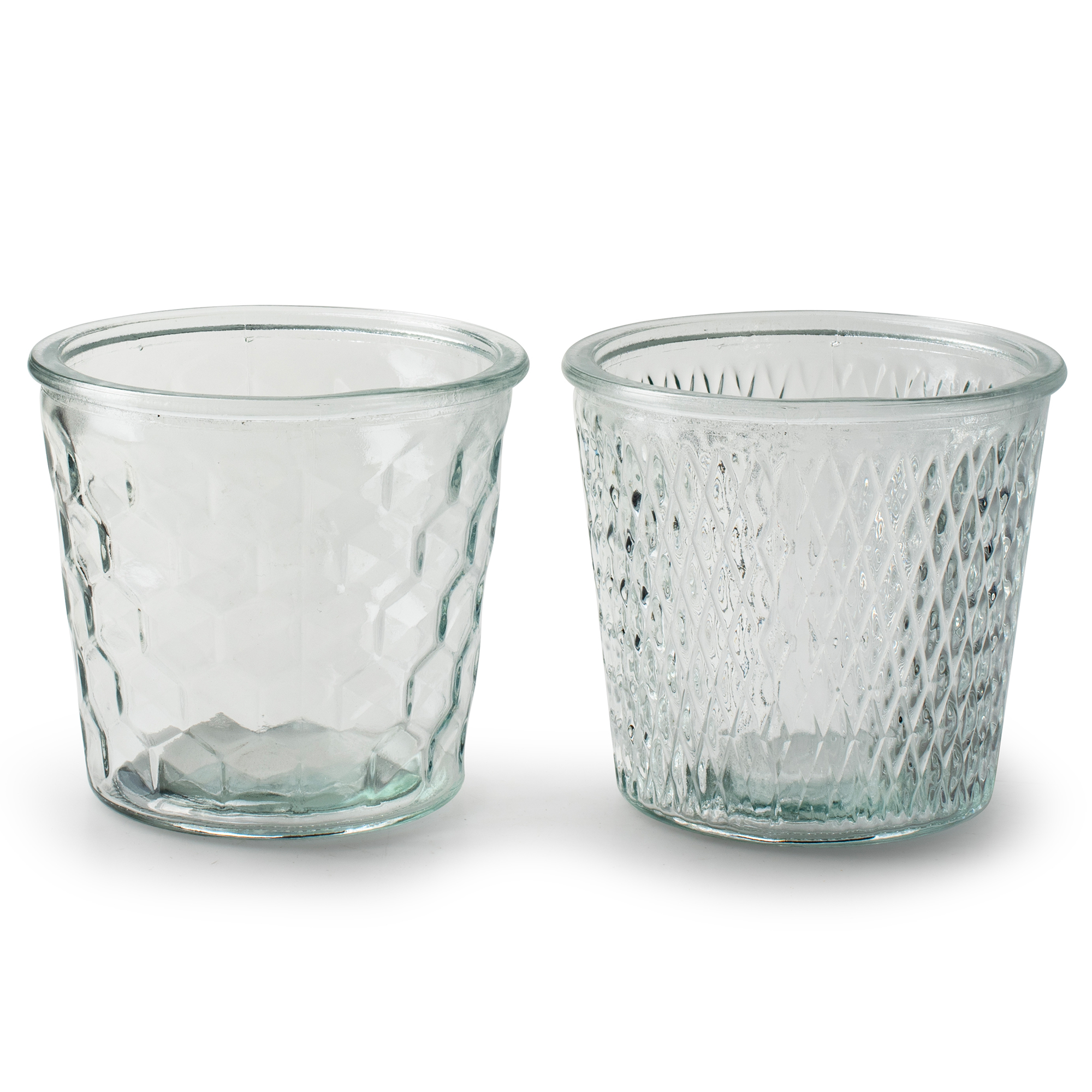 Große Teelichtgläser mit stilvoller Glasmusterung in angesagtem Vintage-Look in unterschiedlichen Modellen für Sie sortiert. Die Kerzengläser können aufgrund des Durchmessers auch gut für große Teelichter verwendet werden. Eine dekorative Tischdeko auch als Blumenvase, somit sind die Gläser sehr variabel einsetzbar.