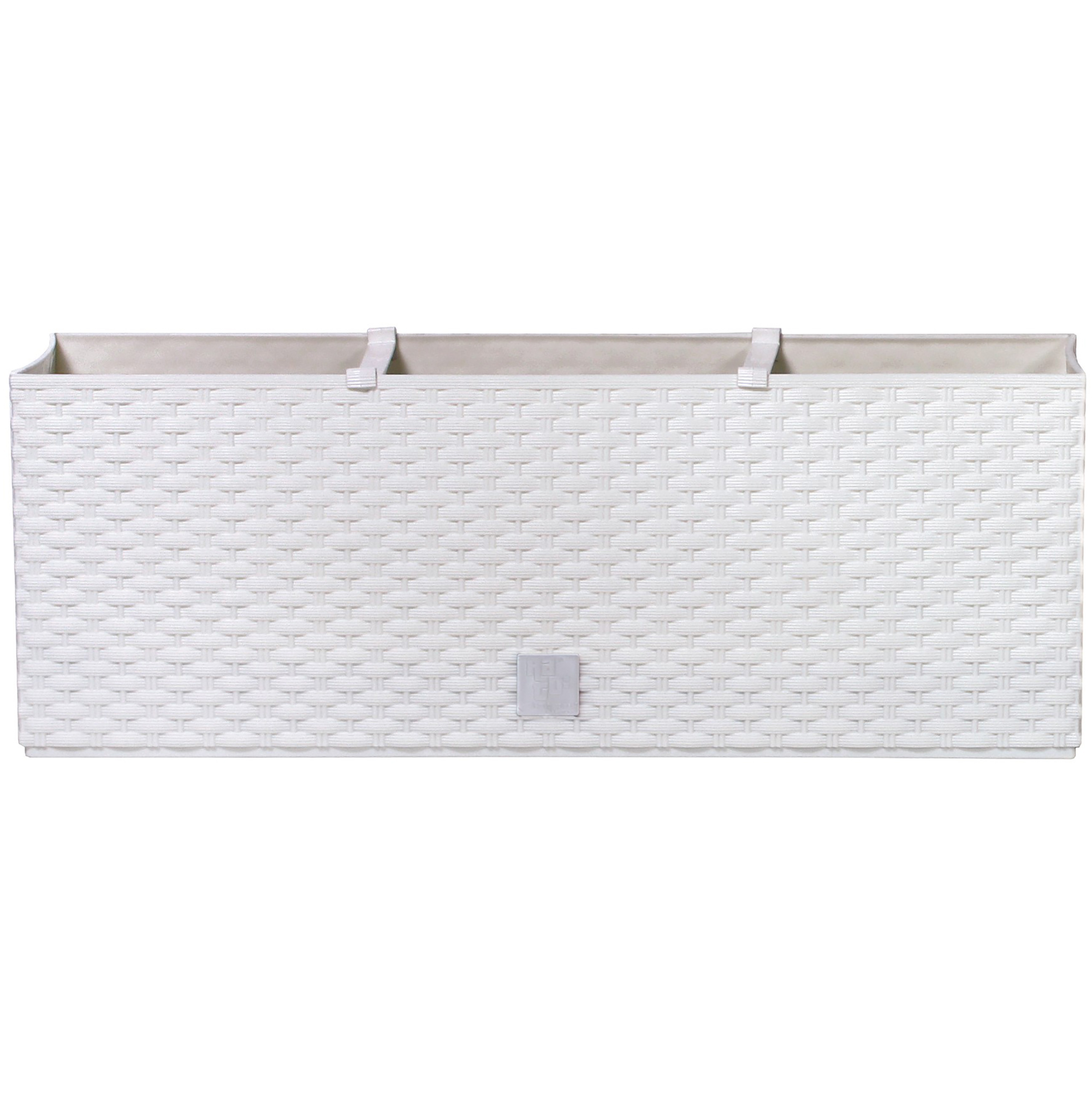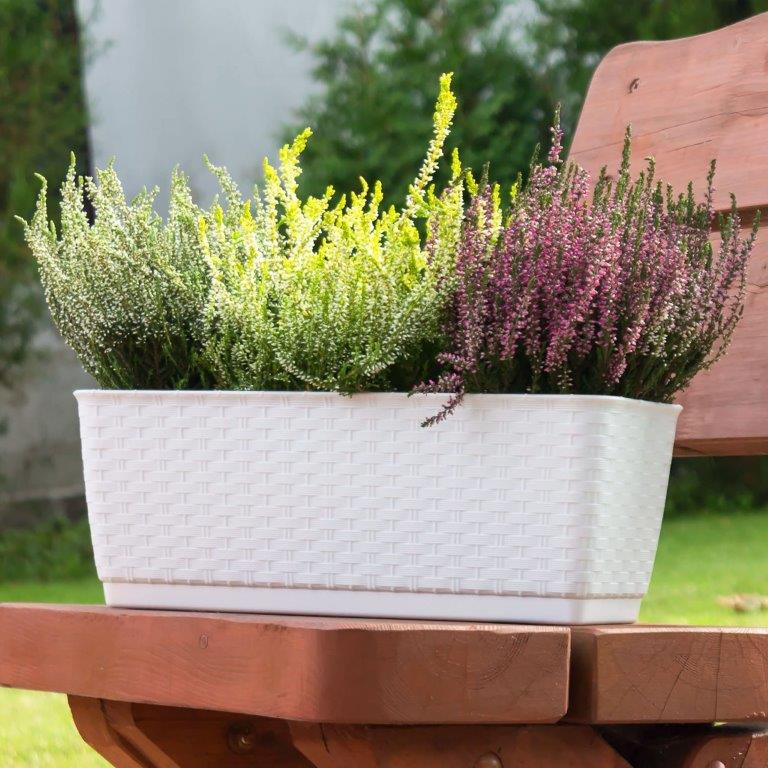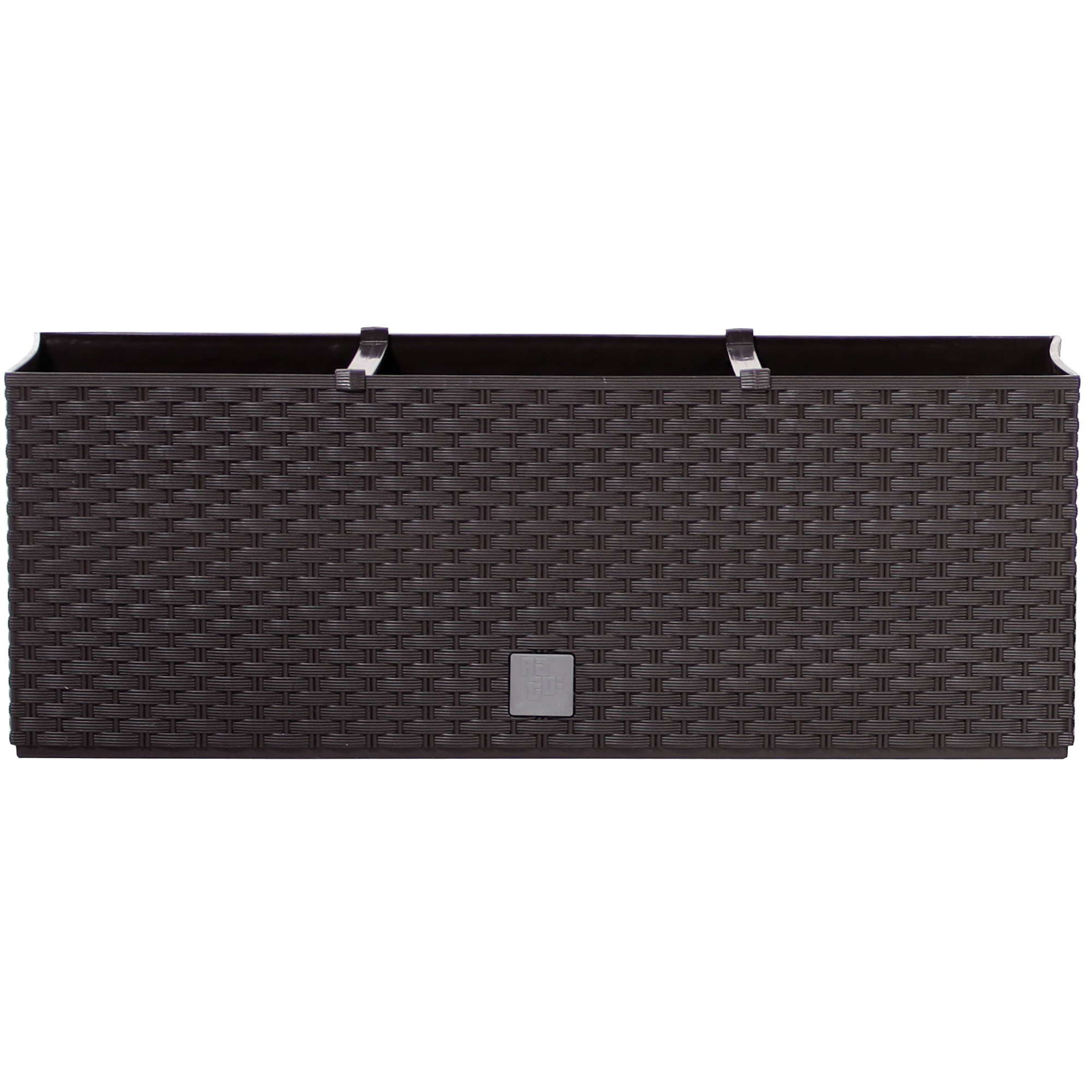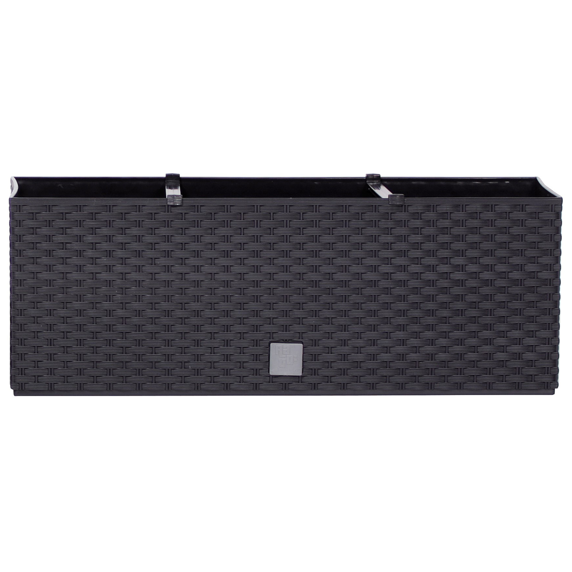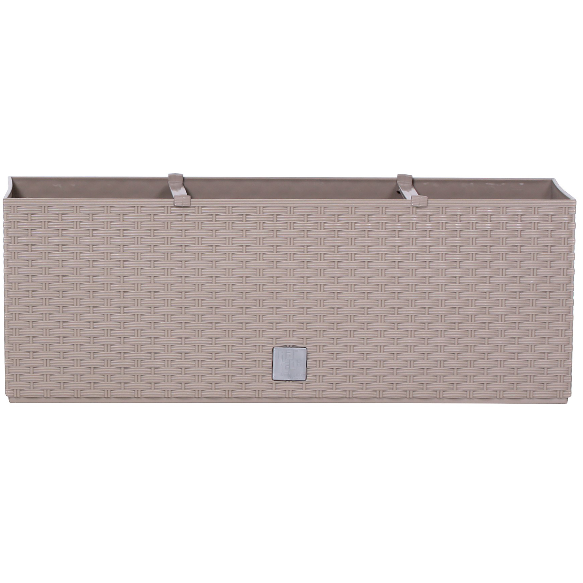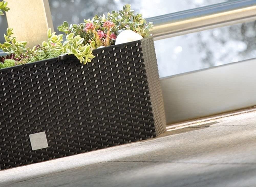 Stilvolle Blumenkästen in zeitlos schöner Rattan-Optik aus hochwertigem Kunststoff (Polypropylen). Mit dem durchdachten Bewässerungssystem ziehen sich die Blumen immer soviel Wasser, wie sie gerade benötigen. Auch im Hochsommer oder wenn Sie einmal im Urlaub sind, werden Ihre Blumen durch das vorhandene Wasser-Reservoir bestens vor einem Austrocknen geschützt. Der Bewässerungseinsatz wird am Boden des Blumenkastens eingesetzt, so bekommen ihre Pflanzen nie nasse Füße und sind dennoch optimal mit Wasser versorgt. Der Pflanzkasten ist aus äußerst strapazierfähigem Material und UV-beständig, widerstandsfähig gegen Frost, Regen und Sonnenlicht. Sie werden aufgrund der Qualität und des Designs viele Jahre Freude an diesen dekorativen Blumenkästen haben. Ein schicker Blickfang im Garten, auf Terrasse oder in Eingangsbereichen.