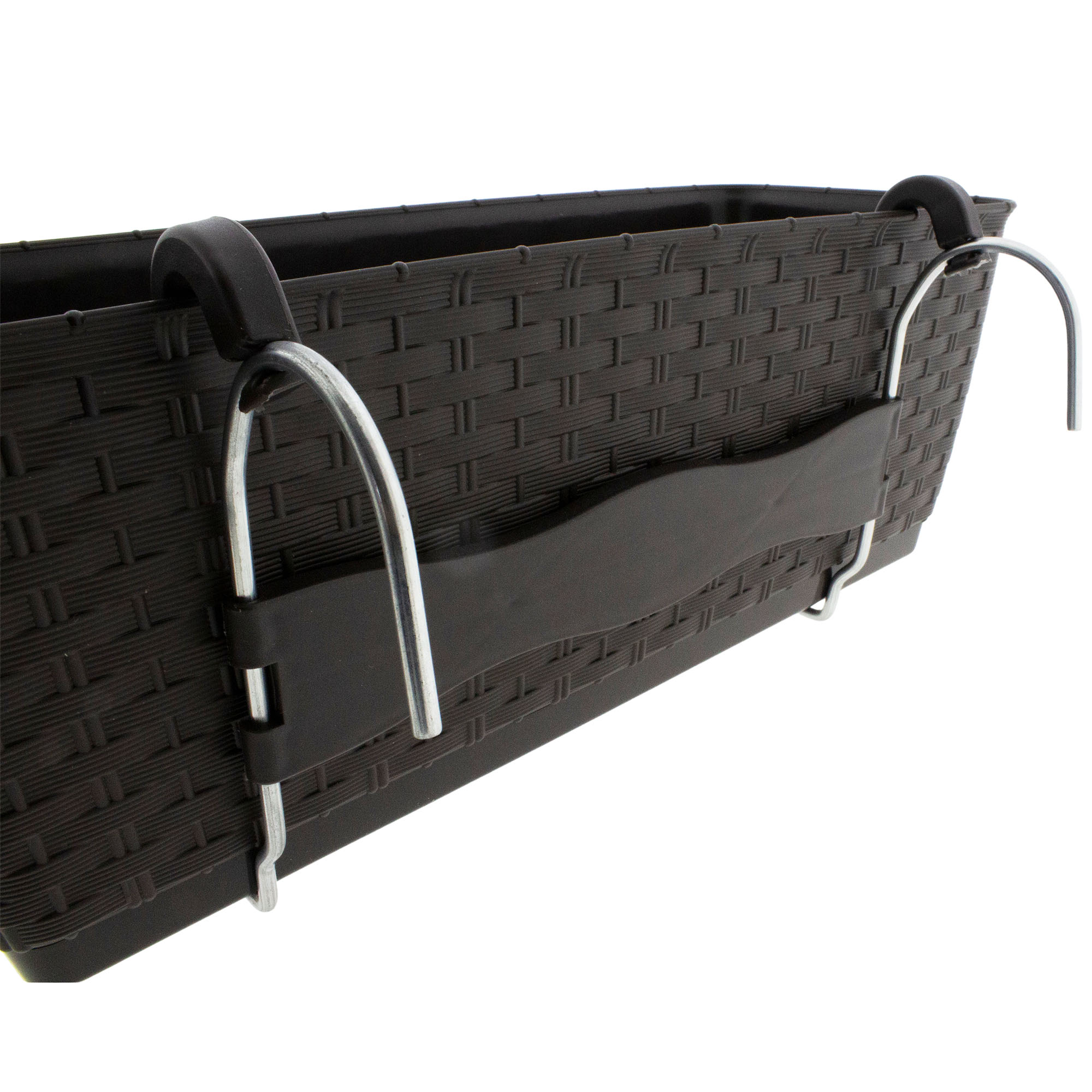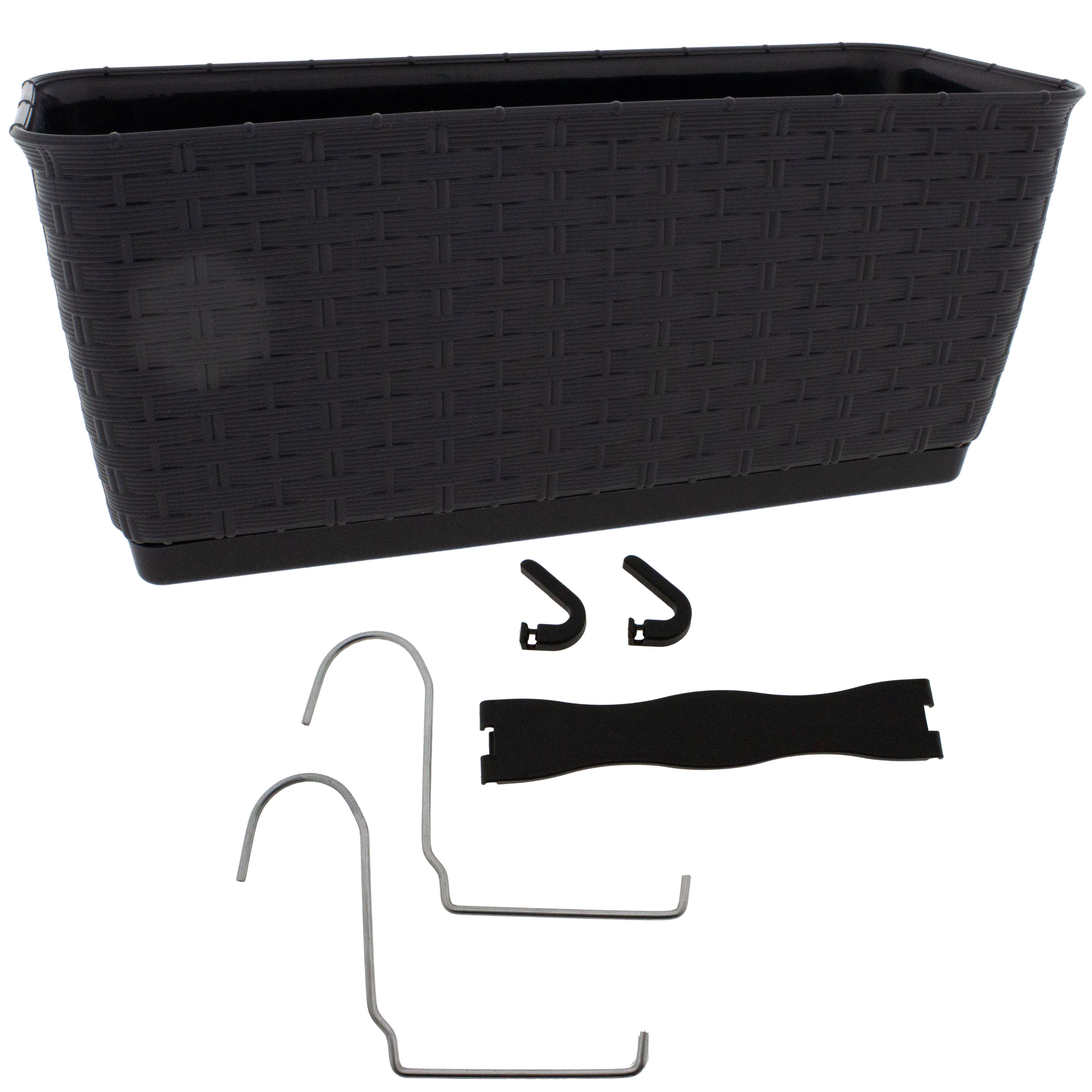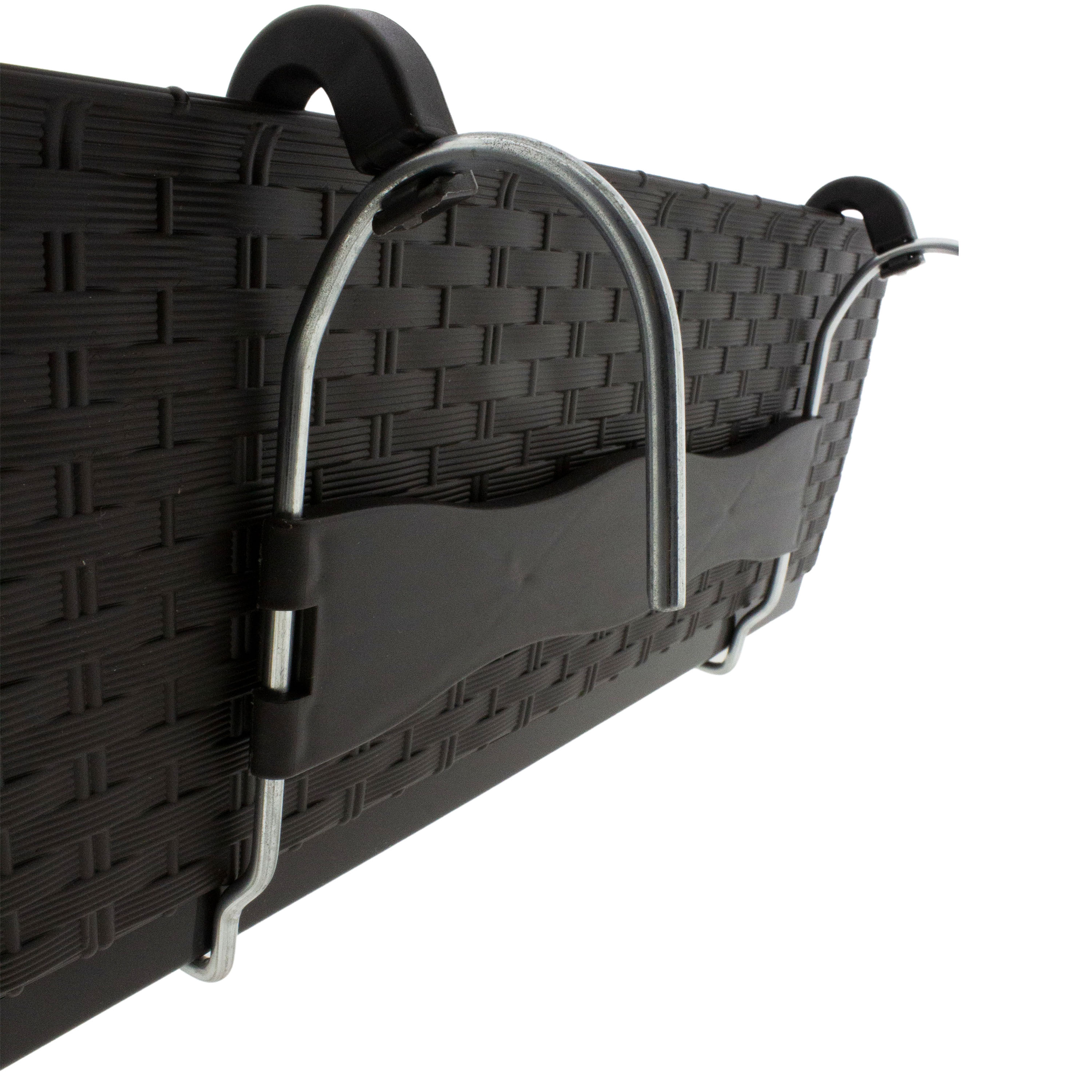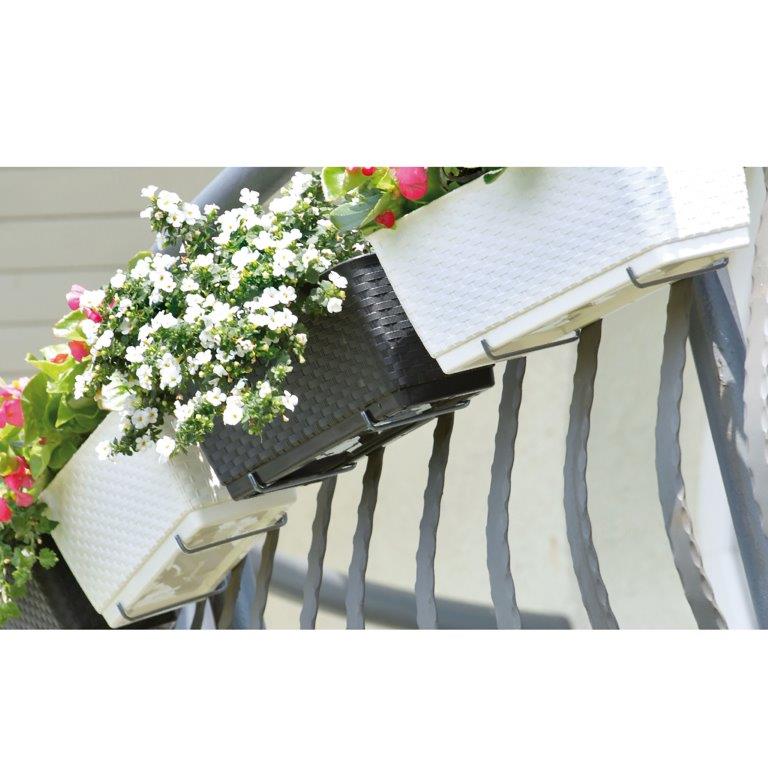Stilvolle Blumenkästen in zeitlos schöner Rattan-Optik aus hochwertigem Kunststoff (Polypropylen). Mit dem durchdachten Bewässerungssystem ziehen sich die Blumen immer soviel Wasser, wie sie gerade benötigen. Perfekt als Blickfang auf Balkon, Terrasse oder auch für Fensterbank und Wintergarten. Das äußerst strapazierfähige Material ist UV-beständig, widerstandsfähig gegen Frost, Regen und Sonnenlicht. Sie werden aufgrund der Qualität und des Designs viele Jahre Freude an diesen dekorativen Blumenkästen haben. Bei den Kästen sind jeweils zwei Halterungen aus Metall, ein Querstück zur Stabilsierung der Halterungen sowie zwei Halterungen aus Kunststoff enthalten.