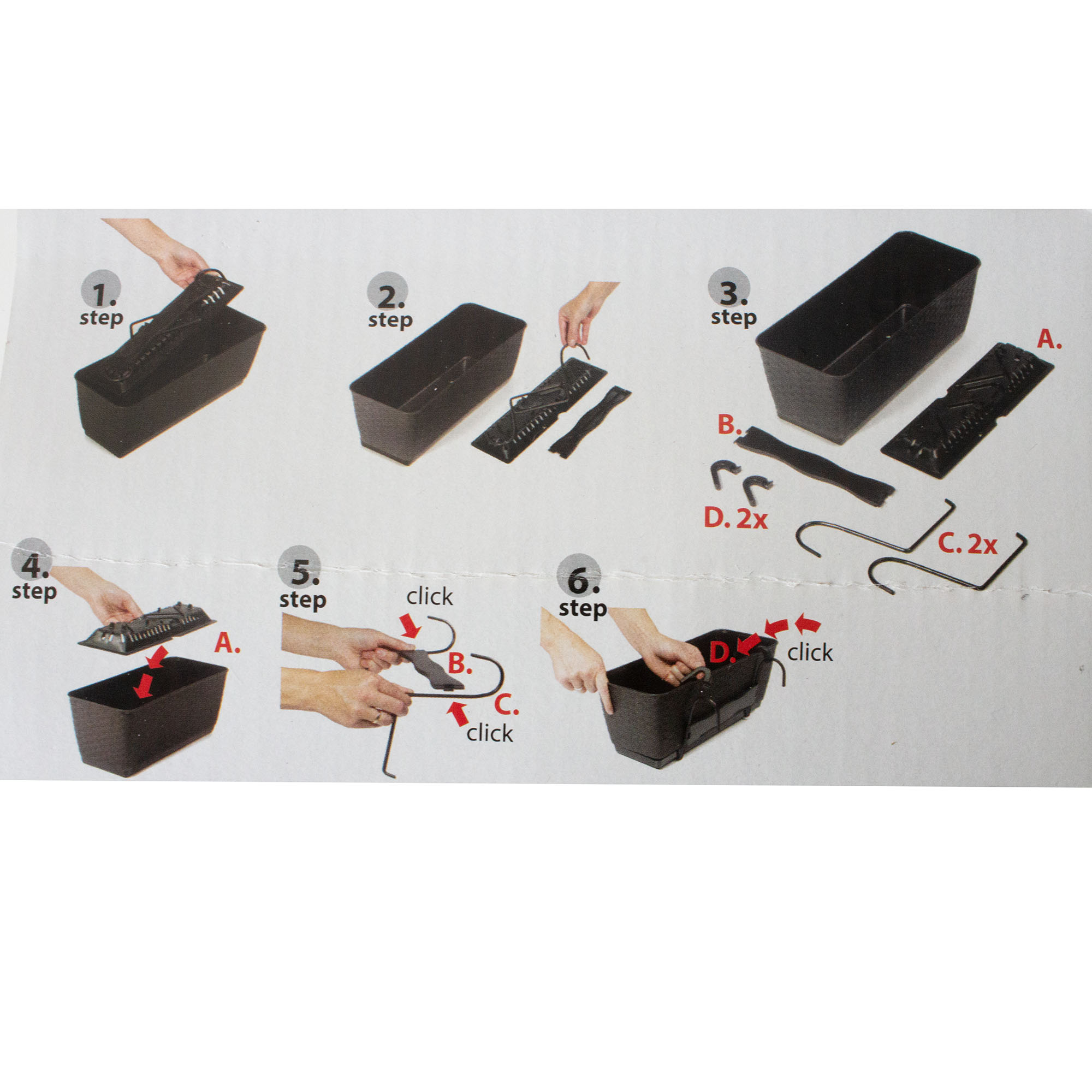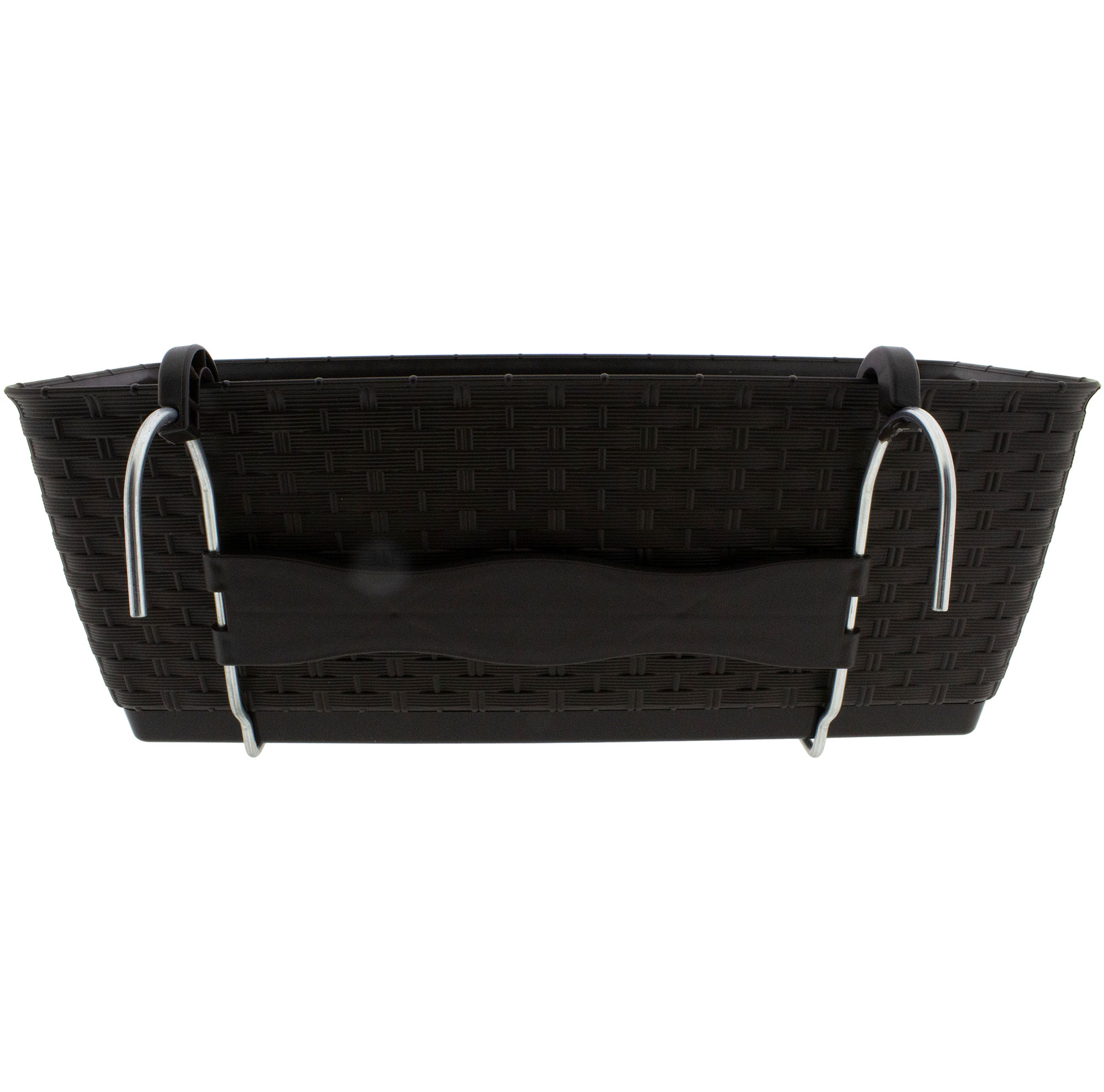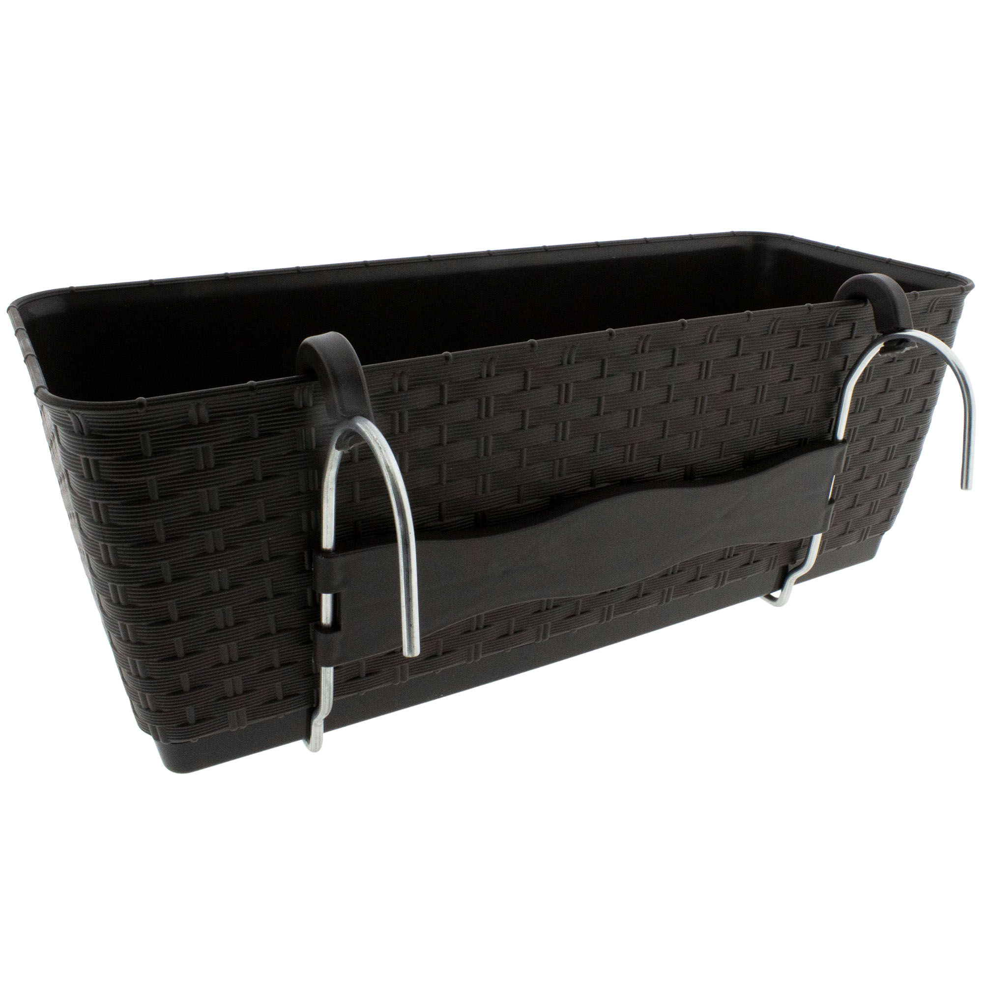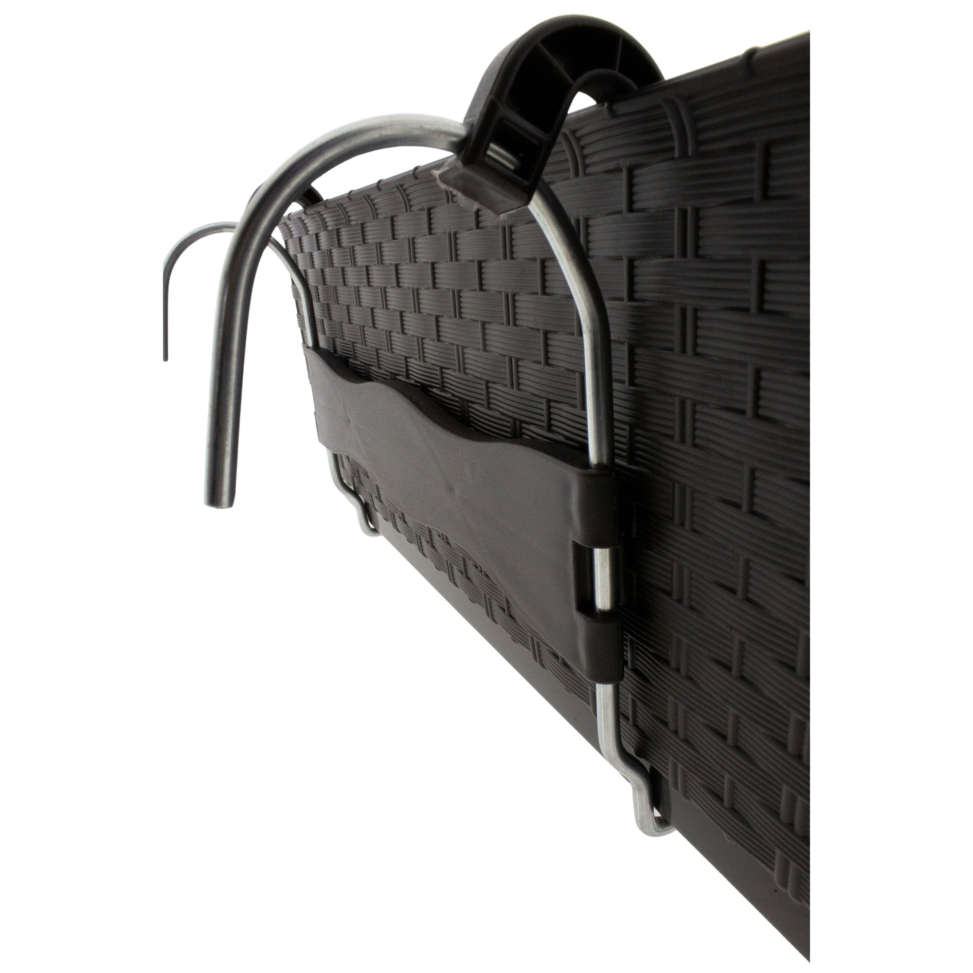 Stilvolle Blumenkästen in zeitlos schöner Rattan-Optik aus hochwertigem Kunststoff (Polypropylen). Mit dem durchdachten Bewässerungssystem ziehen sich die Blumen immer soviel Wasser, wie sie gerade benötigen. Perfekt als Blickfang auf Balkon, Terrasse oder auch für Fensterbank und Wintergarten. Das äußerst strapazierfähige Material ist UV-beständig, widerstandsfähig gegen Frost, Regen und Sonnenlicht. Sie werden aufgrund der Qualität und des Designs viele Jahre Freude an diesen dekorativen Blumenkästen haben. Bei den Kästen sind jeweils zwei Halterungen aus Metall, ein Querstück zur Stabilsierung der Halterungen sowie zwei Halterungen aus Kunststoff enthalten.