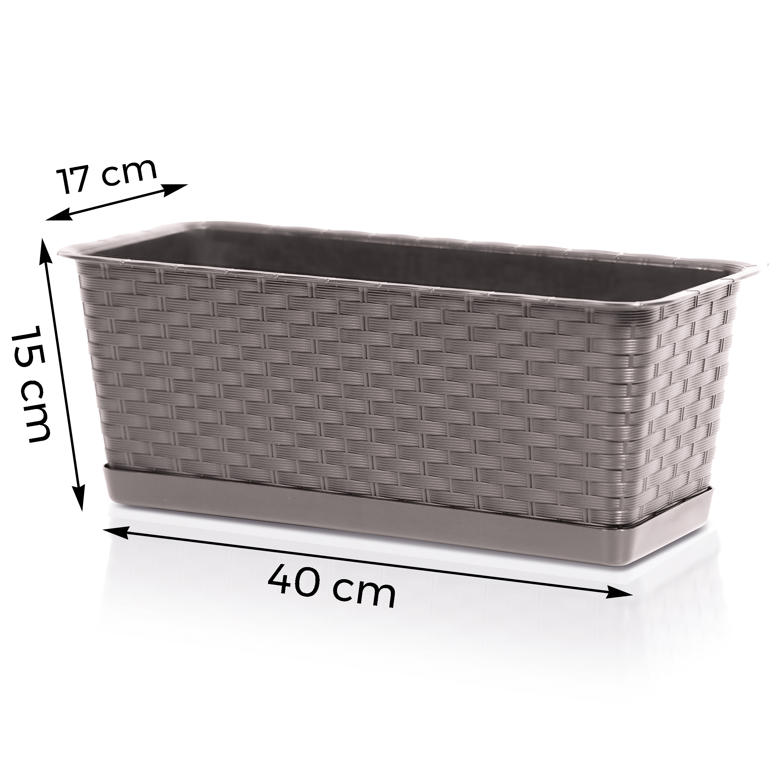 Mit diesem modernen Balkonkasten aus hochwertigem Kunststoff in Rattan-Optik erhalten Sie nicht nur ein optisch ansprechendes Produkt, sondern auch eine praktische Lösung für Ihre Bepflanzungsbedürfnisse. Der integrierte Untersetzer ermöglicht es Ihnen, den Kasten direkt zu bepflanzen und bietet somit eine einfache Handhabung. Durch das Stecksystem kann der Untersetzer problemlos abgenommen werden. Darüber hinaus verfügt dieser Blumentopf über angedeutete Lochungen im Boden, die es Ihnen erlauben, je nach Bedarf Überlauflöcher anzubringen. Dadurch wird gewährleistet, dass überschüssiges Wasser ordnungsgemäß abläuft und die Wurzeln mit ausreichend Sauerstoff versorgt werden. Dieser Balkonkasten vereint also sowohl ästhetisches Design als auch funktionale Eigenschaft auf geschickte Weise - ein absolutes Muss für jeden Gartenliebhaber! Erhältlich ist der Balkonkasten mit passenden Untersetzern in verschiedenen Größen sowie Designs und Farben. Egal ob auf dem Balkon oder der Terrasse platziert oder sogar als Blickfang auf Fensterbänken oder im Wintergarten verwendet – dieses Produkt setzt Akzente und lässt Ihren grünen Daumen erstrahlen. Der moderne Balkonkasten aus hochwertigem Kunststoff in Rattan-Optik überzeugt nicht nur optisch, sondern auch durch seine praktischen Eigenschaften. Dank des integrierten Untersetzers ist er direkt bepflanzbar und bietet somit eine einfache Handhabung. Der Untersetzer wird mit einem Stecksystem am Topf befestigt und kann mühelos durch Ziehen abgenommen werden.
