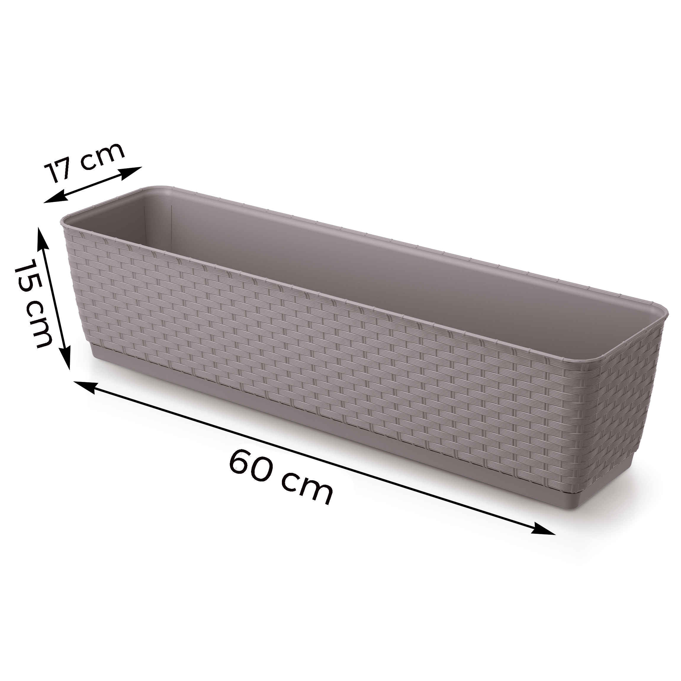 Mit diesem modernen Balkonkasten aus hochwertigem Kunststoff in Rattan-Optik erhalten Sie nicht nur ein optisch ansprechendes Produkt, sondern auch eine praktische Lösung für Ihre Bepflanzungsbedürfnisse. Der integrierte Untersetzer ermöglicht es Ihnen, den Kasten direkt zu bepflanzen und bietet somit eine einfache Handhabung. Durch das Stecksystem kann der Untersetzer problemlos abgenommen werden. Darüber hinaus verfügt dieser Blumentopf über angedeutete Lochungen im Boden, die es Ihnen erlauben, je nach Bedarf Überlauflöcher anzubringen. Dadurch wird gewährleistet, dass überschüssiges Wasser ordnungsgemäß abläuft und die Wurzeln mit ausreichend Sauerstoff versorgt werden. Dieser Balkonkasten vereint also sowohl ästhetisches Design als auch funktionale Eigenschaft auf geschickte Weise - ein absolutes Muss für jeden Gartenliebhaber! Erhältlich ist der Balkonkasten mit passenden Untersetzern in verschiedenen Größen sowie Designs und Farben. Egal ob auf dem Balkon oder der Terrasse platziert oder sogar als Blickfang auf Fensterbänken oder im Wintergarten verwendet – dieses Produkt setzt Akzente und lässt Ihren grünen Daumen erstrahlen. Der moderne Balkonkasten aus hochwertigem Kunststoff in Rattan-Optik überzeugt nicht nur optisch, sondern auch durch seine praktischen Eigenschaften. Dank des integrierten Untersetzers ist er direkt bepflanzbar und bietet somit eine einfache Handhabung. Der Untersetzer wird mit einem Stecksystem am Topf befestigt und kann mühelos durch Ziehen abgenommen werden.