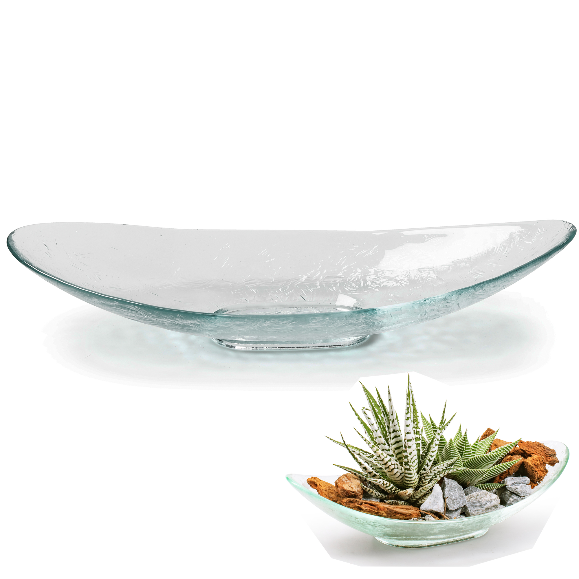 Stilgerechte Schalen mit dezenter Glasmusterung formvollendet in ovaler Form. Die Glasschalen sind selbstverständlich lebensmittelecht und können mit unzähligen Leckereien als Konfektschale oder Plätzchenteller verwendet werden. Zweckentfremdet für ein stilvolles Blumen- oder Pflanzenarrangement ein absoluter Blickfang auf jedem Tisch - Sie können die Dekoschalen aus Glas immer wieder saisonal anders dekorieren....im Sommer mit Kerze und Sand als maritimer Eyecatcher, an Weihnachten mit Zapfen und Kerze als stimmungsvoller Adventsteller. Die Deko-Schalen aus Glas sind sehr variabel einsetzbar und mit Ihrer Kreativität setzen sie immer wieder neue Akzente.