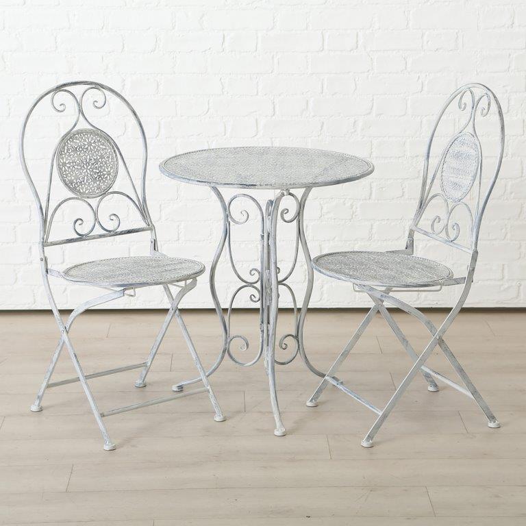 Stilvolle Sitzgruppe im Jugendstil als romantisches 3er Ensemble bestehend aus einem Tisch und zwei Stühlen. Ein bezaubernder Blickfang im Garten auf Balkon und Terrasse. Der kleine Tisch aus Eisen im Antik-Finish sowie die Stühle können zusammengeklappt werden. Die Gartenmöbel sind mit einem Schutzlack versehen, dennoch verändert sich die Patina von Jahr zu Jahr und verleiht dem 3-teiligen Ensemble noch mehr Charme.