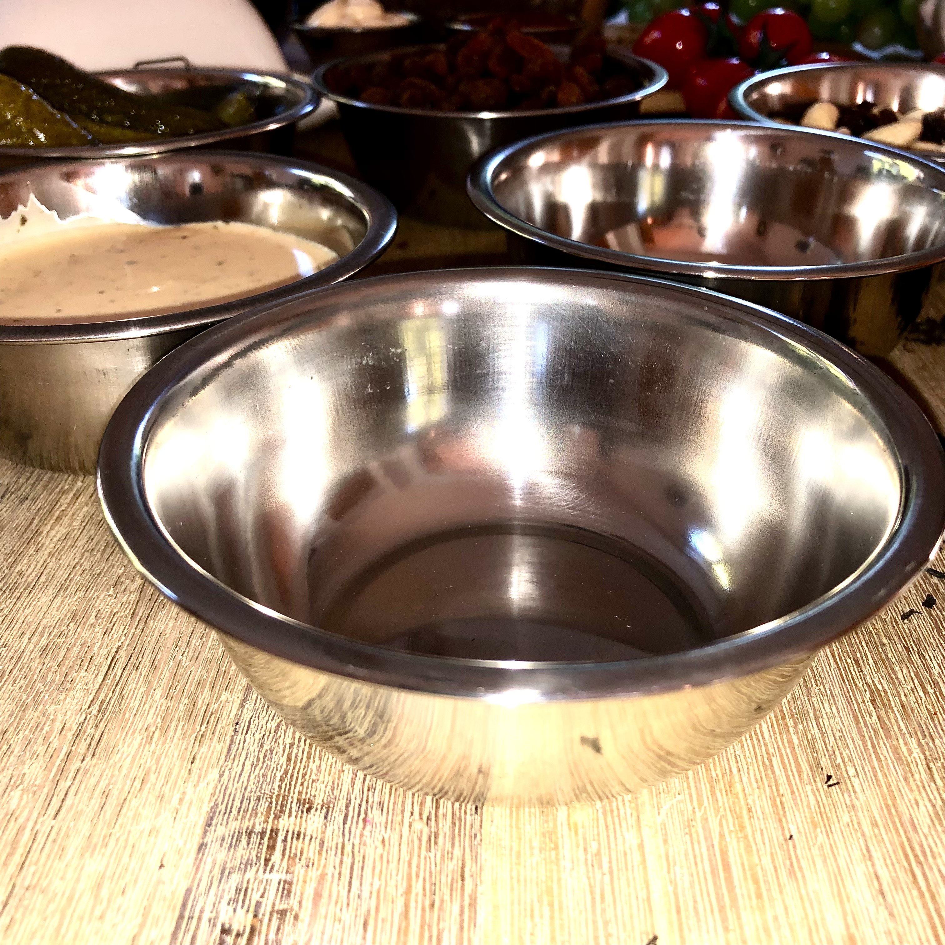 Kleine Saucenschalen in eleganter Optik aus Edelstahl in edel-silberfarben für unzählige Einsatzmöglichkeiten. Robustes Geschirr für Restaurant, Bar und Catering, selbstverständlich auch ideal für Ihr Zuhause. Die Dipschalen können für Gewürze, Dips, Saucen, Obst, Oliven, Nüsse, Pudding, Gelees und vieles mehr verwendet werden. Ideale Schälchen für Saucen zu jedem Anlass, egal ob zum Grillen im Freien, für Picknicks oder für Mahlzeiten Zuhause.