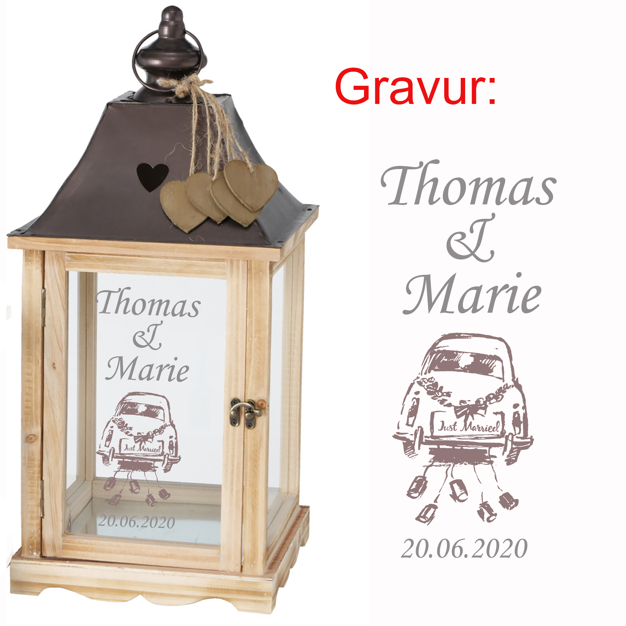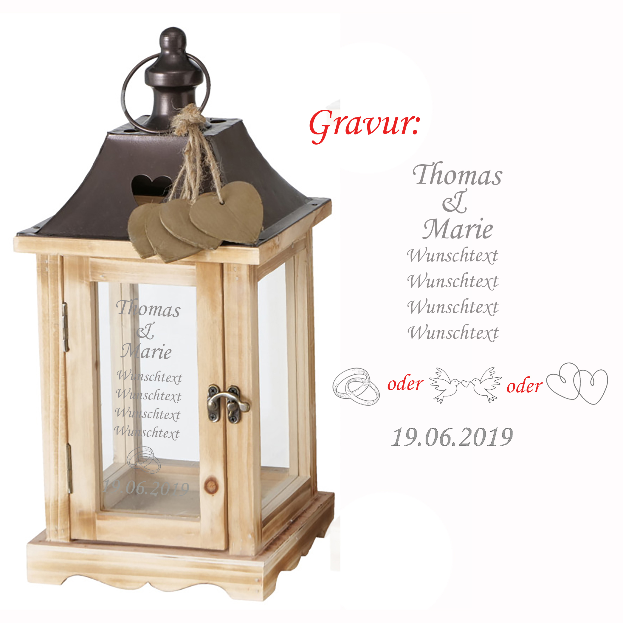 Produktinformationen "Laterne "Salzburg" aus Holz mit persönlicher Gravur zur Hochzeit H 40/54 cm"