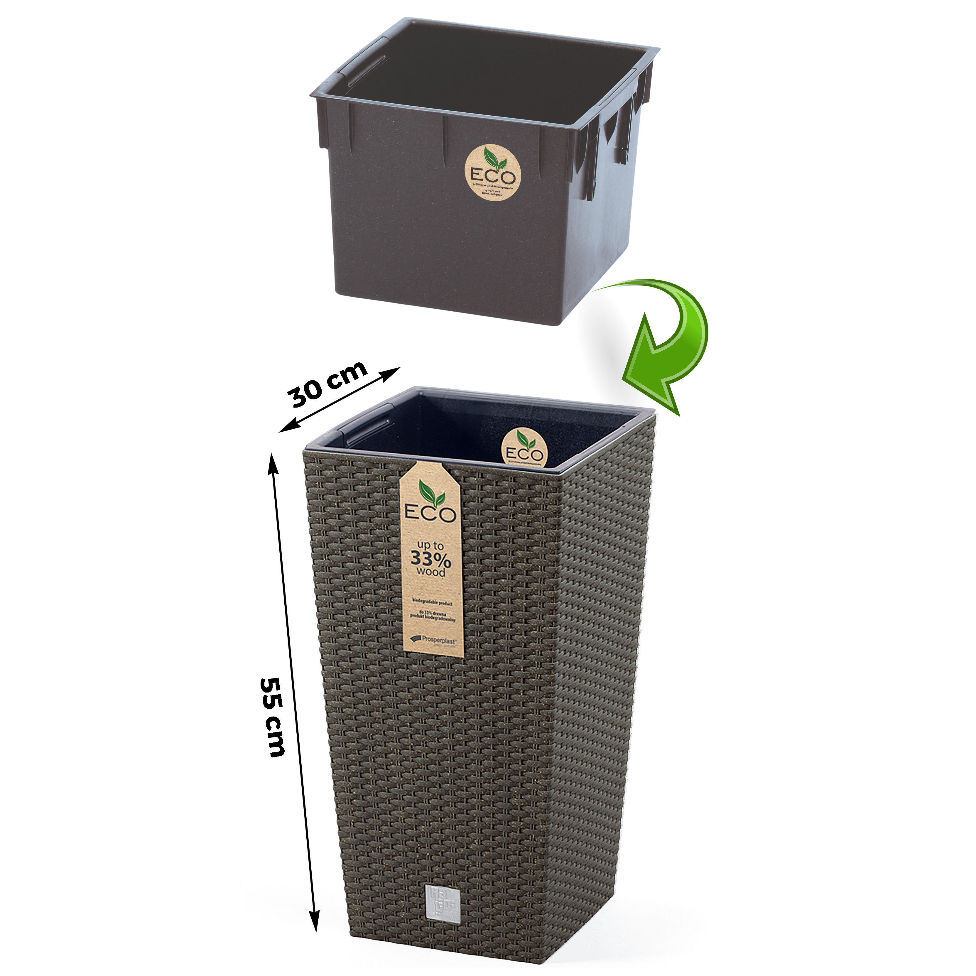 Mit dieser außergewöhnlichen Pflanzsäule im Rattan-Look können Sie eine äußerst angenehme Atmosphäre in Ihrem Zuhause und Garten schaffen. Das stilvolle Design verleiht jedem Raum oder Außenbereich einen Hauch von Eleganz und Exotik. Die Kombination aus dem Rattan-Look und der Robustheit des Kunststoffes macht diese Pflanzsäule zu einem langlebigen und pflegeleichten Accessoire. Die verschiedenen Größen, in denen die Pflanzsäule erhältlich ist, bieten Ihnen zahlreiche Möglichkeiten für kreative Gestaltungen. Sie können mehrere Säulen nebeneinander platzieren oder sie als Blickfang einzeln aufstellen. Durch das Zusammenstellen verschiedener Größen entsteht ein harmonisches Gesamtbild, das Ihren persönlichen Stil unterstreicht. Ein besonderer Vorteil dieser Pflanzsäule ist der herausnehmbare Kunststoffeinsatz. Dadurch wird das Bepflanzen zum Kinderspiel - einfach den Einsatz herausheben, die gewünschten Blumen oder Grünpflanzen hineinsetzen und schon erstrahlt die Säule in ihrer vollen Pracht. Der lästige Aufwand, den gesamten Blumenkübel mit Erde zu befüllen, entfällt somit komplett. Neben der praktischen Handhabung überzeugt diese Pflanzsäule auch durch ihre hochwertige Materialzusammensetzung. Der wetterfeste Kunststoff sorgt dafür, dass Sie lange Freude an diesem dekorativen Element haben werden. Doch das Besondere liegt im Detail: Der Blumentopf enthält einen 33%igen Holzanteil, der ihm ein einzigartiges Aussehen verleiht. Diese Kombination aus Kunststoff und Holz schafft eine harmonische Verbindung zwischen Natürlichkeit und Modernität. Mit dieser außergewöhnlichen Pflanzsäule im Rattan-Look können Sie Ihrer Kreativität freien Lauf lassen und Ihre Wohn- oder Gartenlandschaft individuell gestalten. Egal ob drinnen oder draußen - diese Pflanzsäule wird zum Blickfang in jedem Raum und sorgt für eine angenehme Atmosphäre, die zum Entspannen und Wohlfühlen einlädt.