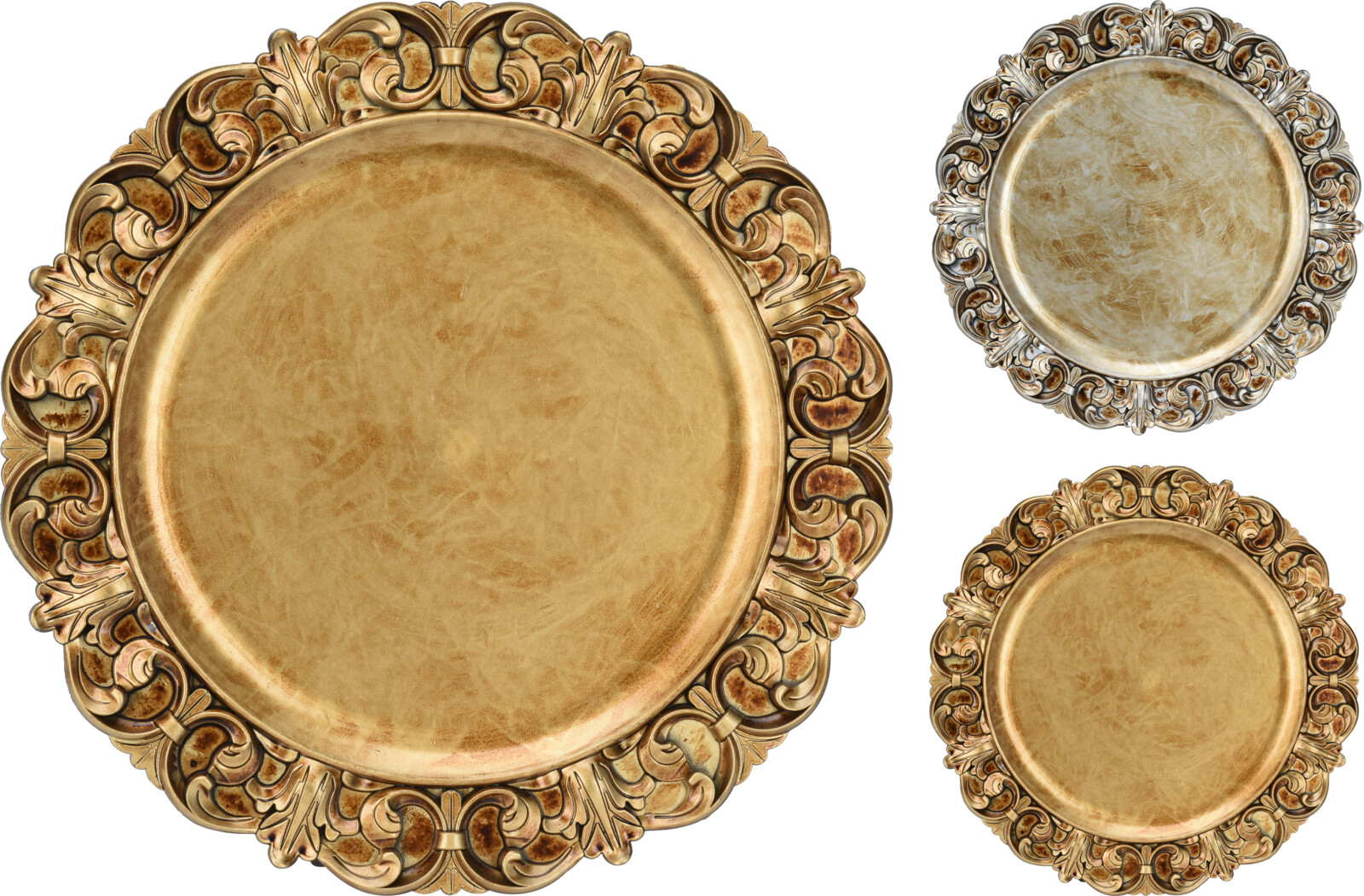 Bringen Sie mit dem exklusiven antik-goldenen oder antik-silbernen Platztellern eine festliche Stimmung auf den Tisch. Der aufwendig gearbeitet barocke Rand des Platztellers macht diesen zu einem absoluten Highlight auf jeder festlich gedeckten Tafel. Der dekorative Unterteller aus strapazierfähigem Kunststoff sollte mit Hand gewaschen werden. Selbstverständlich ist der charakteristische Teller immer wieder verwendbar und aufgrund des Materials sehr langlebig. Ein perfektes Accessoires für den Tisch..... für alle die das Außergewöhnliche lieben.