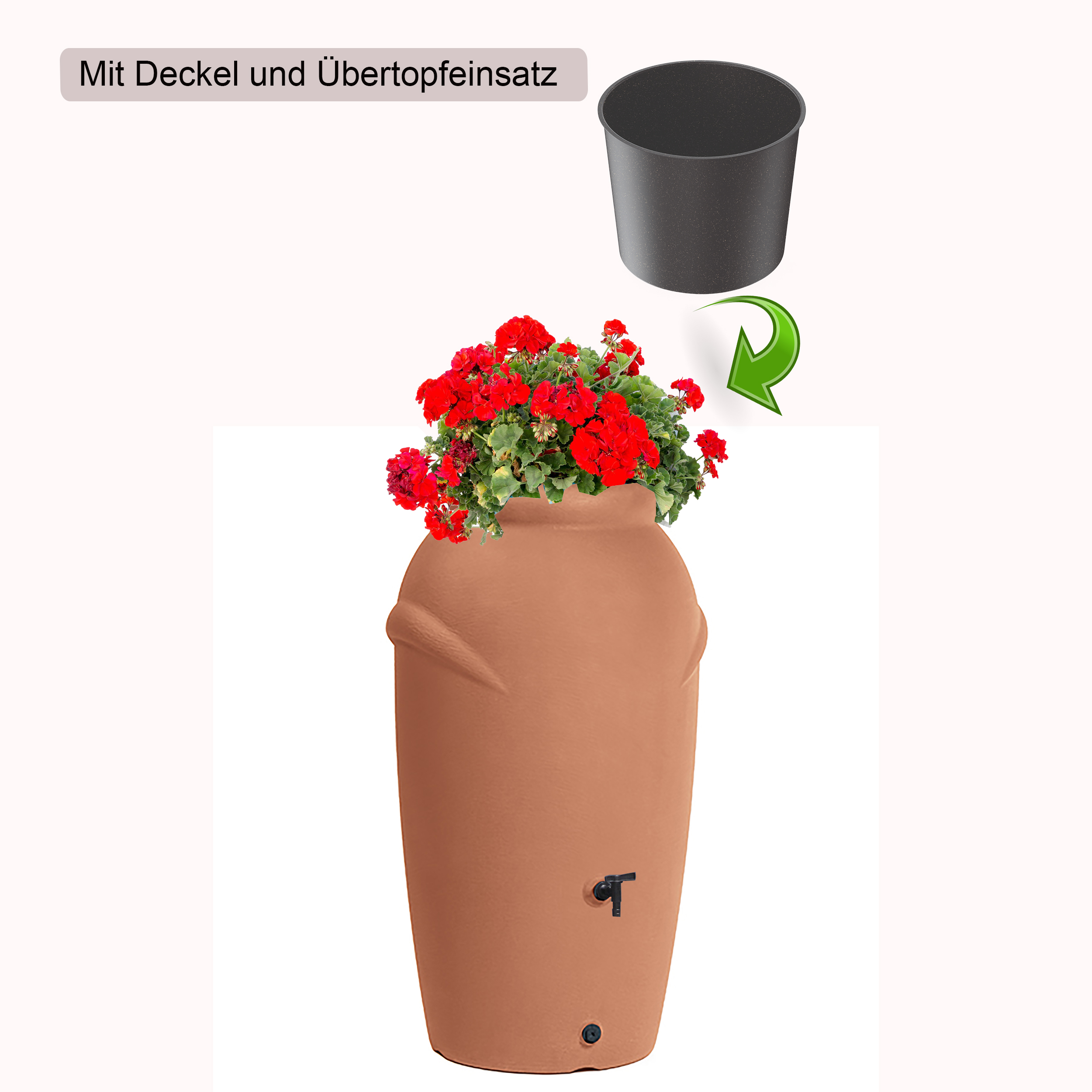 Nutzen Sie unsere klassische Regentonne in Form einer stilvollen Amphore, um kostbares Wasser zu sparen und gleichzeitig Ihren Garten nachhaltig zu bewässern. Mit einem beeindruckenden Fassungsvermögen von 210 Litern ist dieser elegante Wassertank nicht nur platzsparend, sondern auch ein wahrer Blickfang in Ihrem Außenbereich. Die mitgelieferte Pflanzschale ermöglicht es Ihnen, Ihre Blumen direkt am Wasser zu positionieren - praktisch und ästhetisch zugleich. Hergestellt aus wetterbeständigem Kunststoff, ist die Regentonne frost- und UV-beständig. Um sicherzustellen, dass sie lange hält, empfehlen wir das regelmäßige Entleeren des Tanks während der Wintermonate. Dank des eingebauten Wasserhahns können Sie das gesammelte Regenwasser bequem ablassen oder für die Bewässerung Ihres Gartens nutzen. Das Set enthält alles was Sie brauchen: eine Regentonne mit Deckel sowie Pflanzschale und einen praktischen Wasserhahn für den einfachen Zugriff auf Ihr gespeichertes Regenwasser. Investieren Sie jetzt in dieses umweltfreundliche Produkt und leisten Sie einen Beitrag zum Schutz unserer kostbaren Ressourcen. Das Regenfass besitzt 2 Anschlüsse für Wasserhähne/Wasserschläuche ¾ Zoll. Die Regentonne wird im Set mit Wasserhahn, Deckel sowie Pflanzschale ausgeliefert.