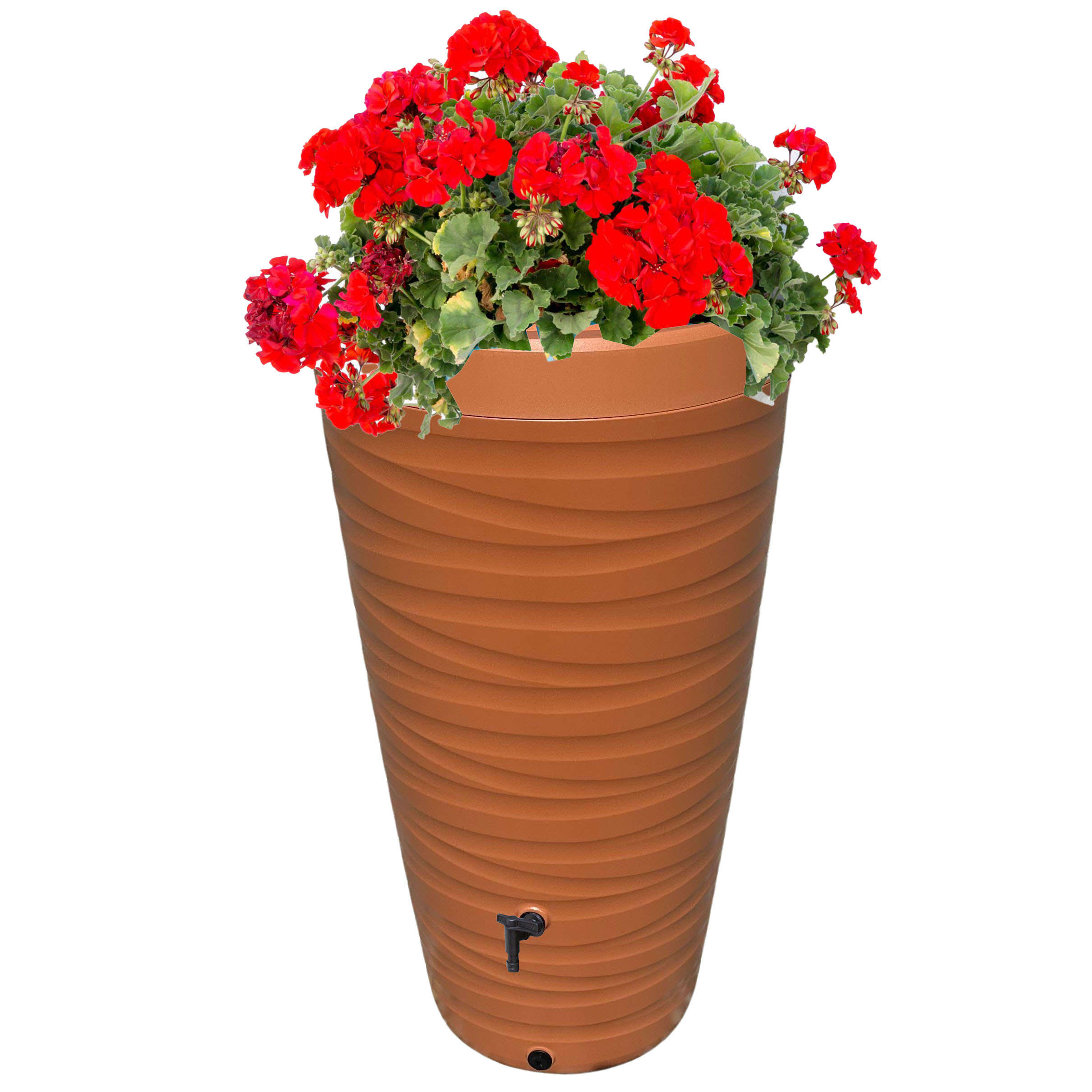 Mit unserer Regentonne in elegante konischer Form können Sie die Verschwendung von Wasser vermeiden. Seien Sie umweltbewusst, indem Sie auf das Regenwasser zurückgreifen, um Ihren Garten zu bewässern. Der stilvolle Wassertank bietet ein Fassungsvermögen von beeindruckenden 240 Litern. Trotz seiner schlanken Größe spart der Tank Platz und wirkt dennoch modern und elegant. Die mitgelieferte Pflanzschale ermöglicht es den Blumen direkt an der Wasserquelle zu wachsen - praktisch und ästhetisch zugleich. Hergestellt aus wetterbeständigem Kunststoff ist die Regentonne frost- und UV-beständig. Beim Überwintern sollte das Wasser stets abgelassen werden. Ein integrierter Wasserhahn erleichtert das Entleeren des Tanks. Zwei Anschlüsse für Wasserschläuche mit einem Durchmesser von ¾ Zoll sind vorhanden. Das Set beinhaltet neben der Regentonne auch einen Deckel sowie die Pflanzschale zur direkten Bepflanzung am Tankrand.