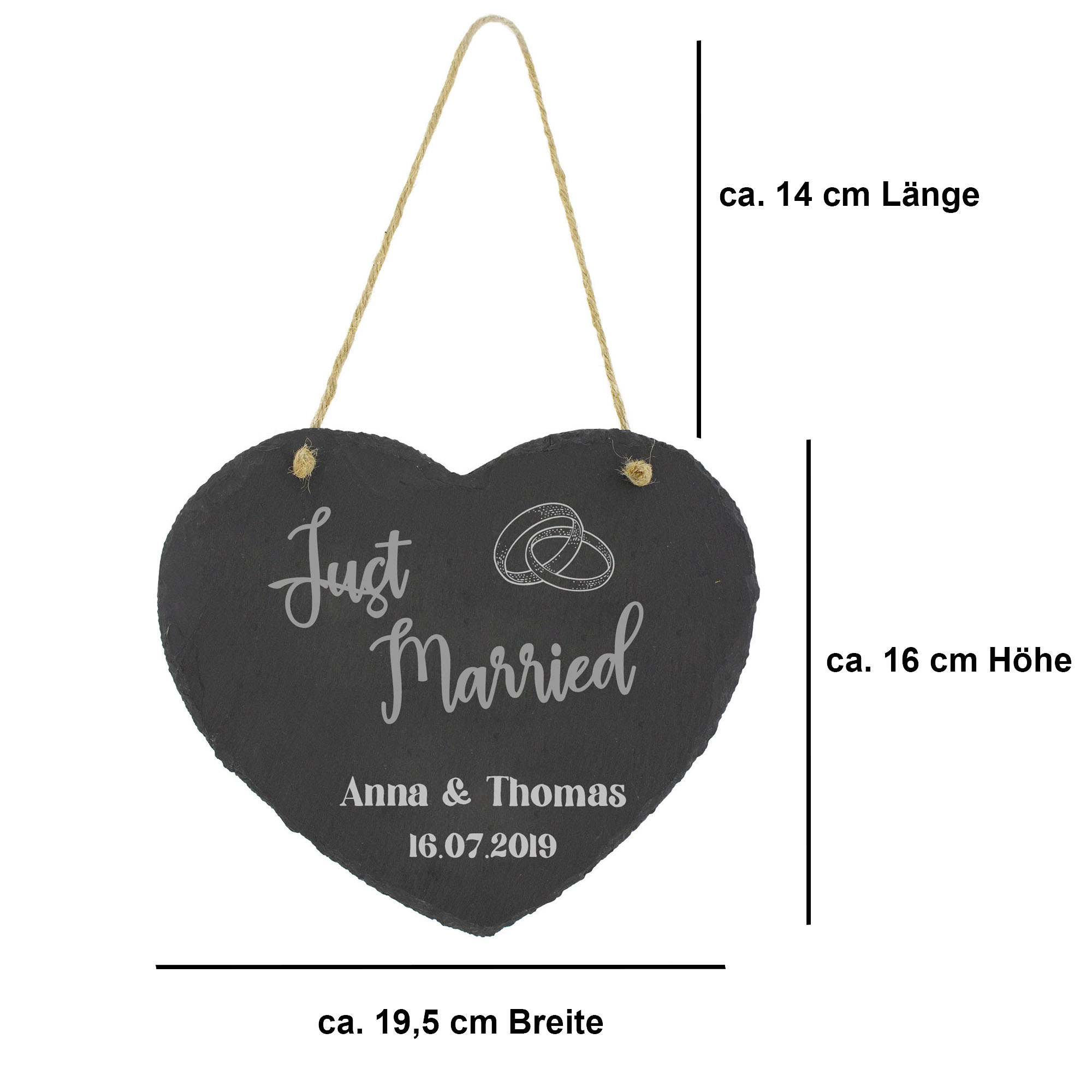 Wie wär´s mit einem sehr persönlichen Geschenk wie einem originellen Türschild? Individuell für Ihre Familie gestaltet. Dann lassen Sie doch ein bezauberndes Herz aus Schiefer mit Schnur aus Jute zum Hängen gravieren. Persönliche Gravur nach Ihrem Wunsch eingeben und schon wird dieses Schieferherz zum einzigartigen Unikat als perfektes Hochzeitsgeschenk. Ob zum Einzug oder Hausbau, als Weihnachtsgeschenk für Eltern und Freunde oder einfach so zur Verschönerung des Hauseigangs. Nennen Sie uns einfach Ihre Wunschnamen und das Datum, die (Ringe,Herzen) und "Just Married" oder "Mr. & Mrs. werden ebenso für Sie eingraviert. Ein dekorativer Blickfang für Besucher und Gäste, das rustikale Schiefergestein verleiht dem Eingangsbereich einen zauberhaften Vintage-Look. Mit der Jute-Schnur lässt sich das in Herzform geschnittene Schild nach Belieben aufhängen. Immer eine tolle und persönliche Geschenkidee.