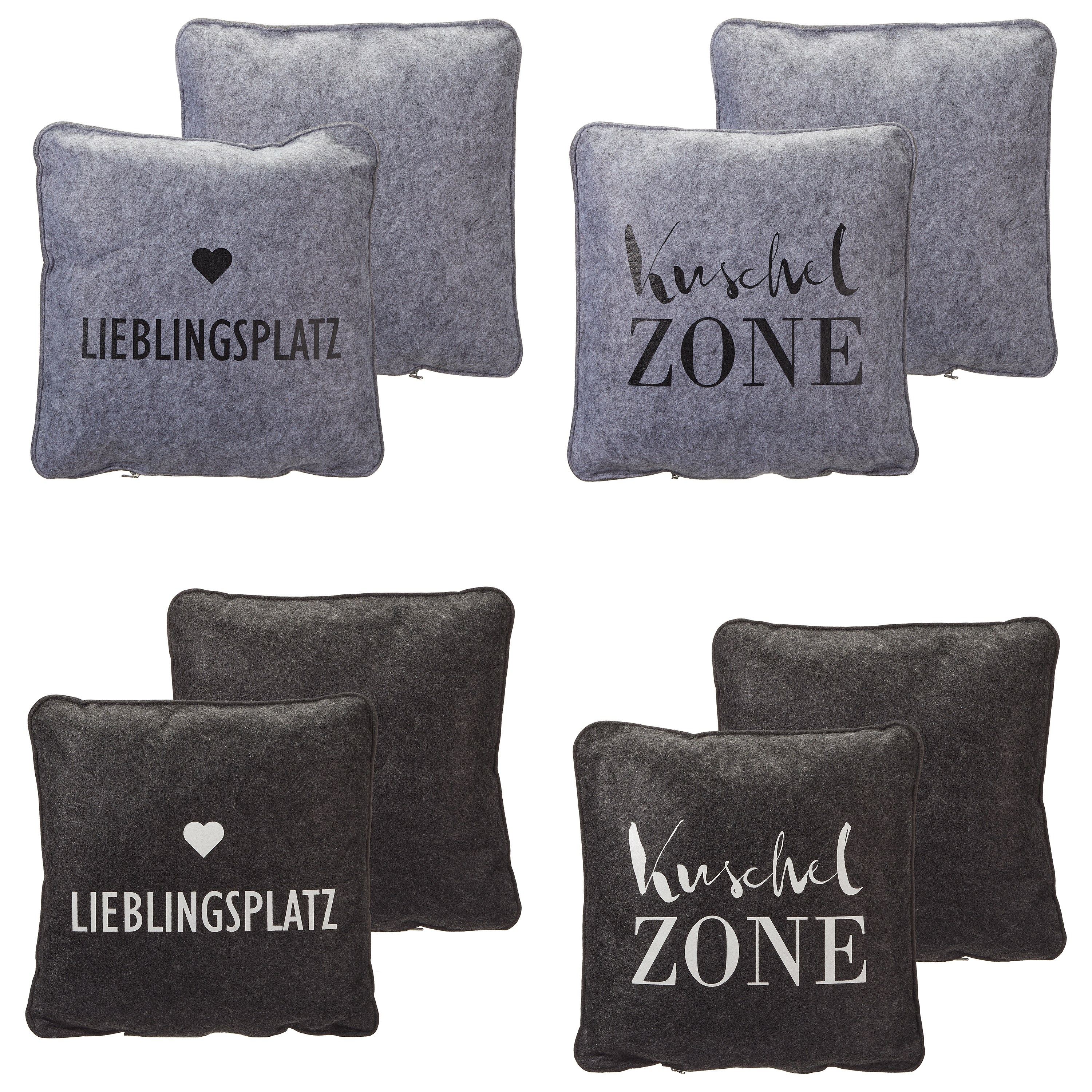 Aparte Kuschelkissen aus Filz mit dem Aufdruck KUSCHELZONE und LIEBLINGSPLATZ. Dank der Farben lassen sich die Deko-Kissen zu vielen Einrichtungenstilen kombinieren.