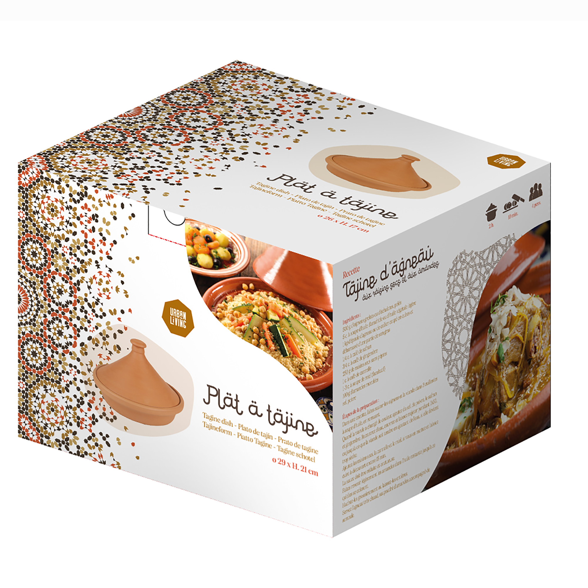 Die zirkuszeltartige Tajine aus Ton ist ein in Nordafrika seit Jahrhunderten gebrauchtes Küchenutensil für das Schmoren von Fisch, Fleisch- und Gemüsegerichten. Selbst Reis und Couscous lassen sich damit spielend leicht zubereiten. Die Tajine besteht aus massiver, ofenfester Keramik mit einer farbenfrohen, zum Orient passenden Optik. In der Tajine brennt nichts an, die Hitze wird gleichmäßig verteilt und die Zubereitung ist sehr einfach. Tajine auf die Herdplatte stellen, erst Zwiebeln und Fleisch anbraten, dann Gemüse, Gewürze und Kräuter und schließlich Wasser oder Brühe hinzufügen. Den Deckel aufsetzen und das Ganze bei kleiner Hitze garen. Durch die einzigartige Form schmoren die Zutaten im eigenen Saft und der zirkulierende Dampf verteilt die Aromen gleichmäßig.