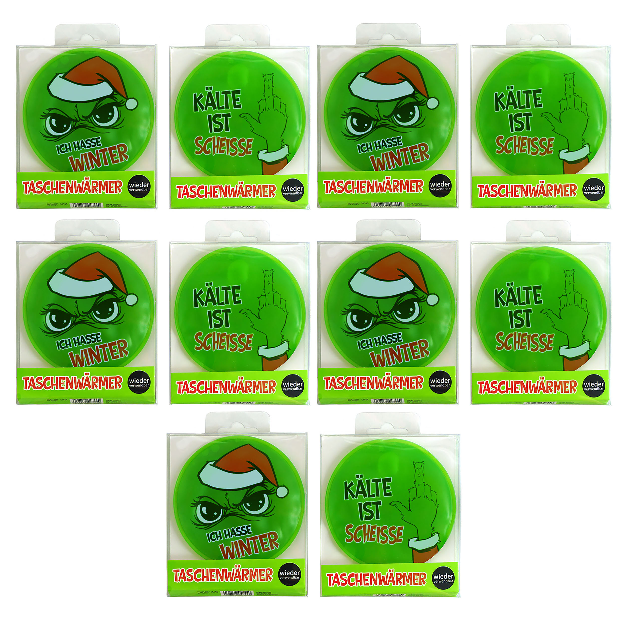 Willkommen zu unserem neuen Produkt - den festlichen Taschenwärmern für alle Weihnachtsmuffel da draußen! Mit ihrem knalligen giftgrünen Design und dem frechen Spruch "Ich hasse Winter" und " Kälte ist Scheiße" sind diese Taschenwärmer nicht nur ein echter Hingucker, sondern auch ein praktischer Begleiter in der kalten Jahreszeit. Egal ob beim Winterspaziergang oder im Fußballstadion - mit diesen trendigen Taschenwärmern bleibst du garantiert warm. Die Handwärmer bestehen aus hochwertigem Kunststoff und haben einen Durchmesser von 8,5 cm. Einfach das Metallplättchen knicken und schon werden die Taschenwärmer warm. Und das Beste: Du kannst sie bis zu 1000 mal wieder aufladen, indem du sie einfach für einige Minuten in heißes Wasser legst. Also, lass dich von unserer Festtags-Muffel Kollektion überzeugen und hol dir jetzt deine witzigen Taschenwärmer, die dich nicht nur warm halten, sondern auch jedes Mal ein Lächeln auf dein Gesicht zaubern werden. Mach dich bereit für die kalte Jahreszeit mit unseren einzigartigen Taschenwärmern!