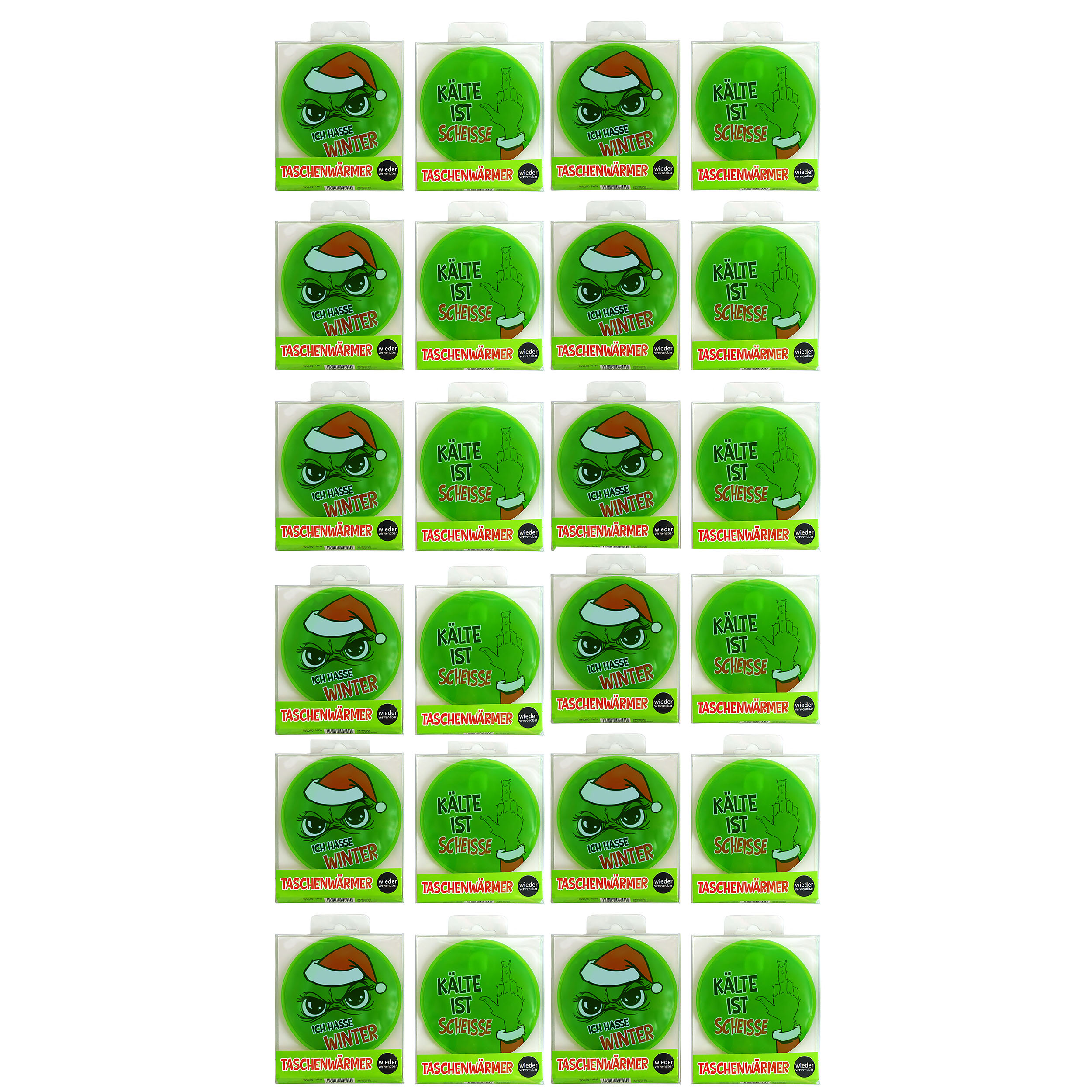 Willkommen zu unserem neuen Produkt - den festlichen Taschenwärmern für alle Weihnachtsmuffel da draußen! Mit ihrem knalligen giftgrünen Design und dem frechen Spruch "Ich hasse Winter" und " Kälte ist Scheiße" sind diese Taschenwärmer nicht nur ein echter Hingucker, sondern auch ein praktischer Begleiter in der kalten Jahreszeit. Egal ob beim Winterspaziergang oder im Fußballstadion - mit diesen trendigen Taschenwärmern bleibst du garantiert warm. Die Handwärmer bestehen aus hochwertigem Kunststoff und haben einen Durchmesser von 8,5 cm. Einfach das Metallplättchen knicken und schon werden die Taschenwärmer warm. Und das Beste: Du kannst sie bis zu 1000 mal wieder aufladen, indem du sie einfach für einige Minuten in heißes Wasser legst. Also, lass dich von unserer Festtags-Muffel Kollektion überzeugen und hol dir jetzt deine witzigen Taschenwärmer, die dich nicht nur warm halten, sondern auch jedes Mal ein Lächeln auf dein Gesicht zaubern werden. Mach dich bereit für die kalte Jahreszeit mit unseren einzigartigen Taschenwärmern!