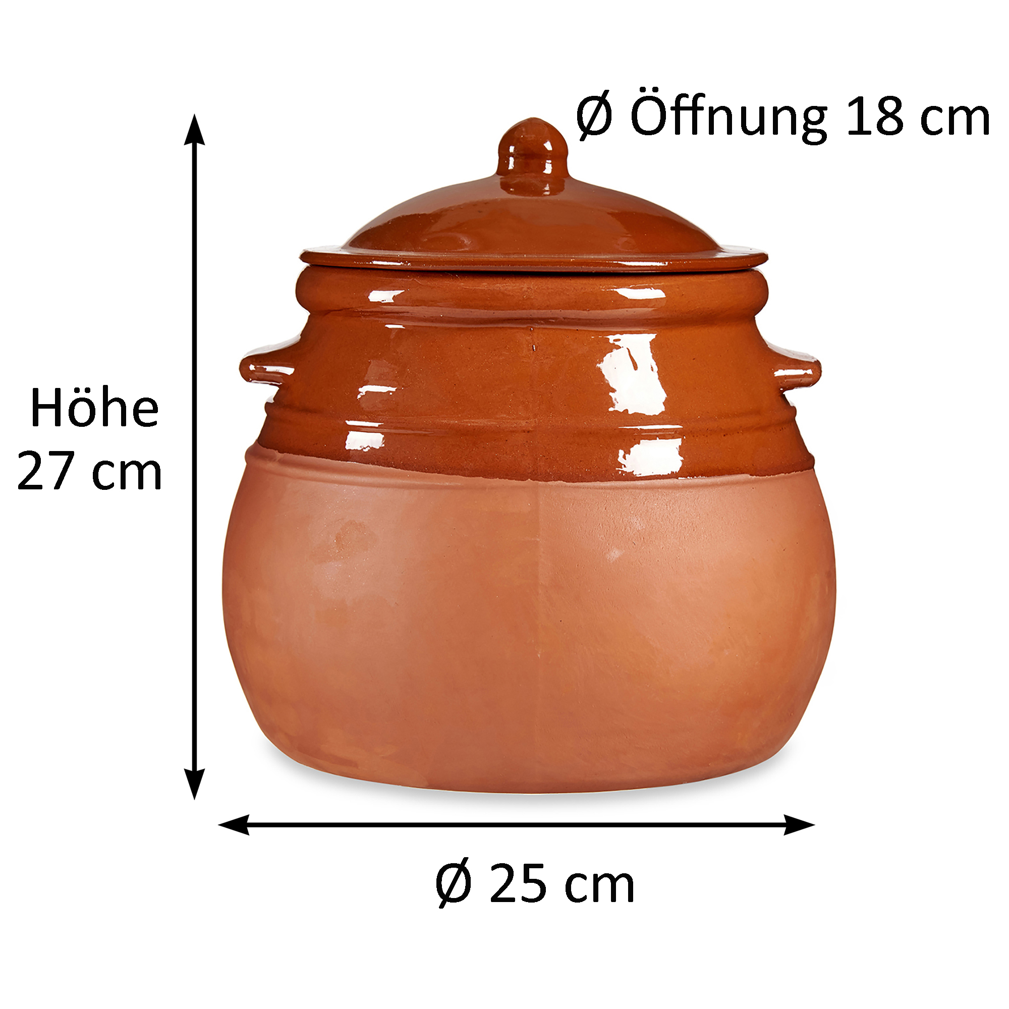 Die hochwertigen und sehr ursprünglichen Tontöpfe mit Deckel stammen aus dem warmen Mittelmeerraum und vereinen zeitgenössisches Kochen mit einer sehr alten Handwerkskunst. Jeder Topf ist von Hand end-veredelt und somit ein Unikat. Der teilglasierte Topf hat links und rechts handliche Griffe. Leichte Farbabweichung sind kein Qualitätsmangel sondern unterstreichen die Einzigartigkeit sowie den Charme des Produkts.Die Cocotte ist teilglasiert und für den Backofen geeignet – Ideal als Auflaufform, für Ragout, aromatische Schmorgerichte, Eintopf und selbstverständlich auch für leckeres Soufflè. Ton verfügt über eine hervorragende Wärmeverteilung, nimmt weder Fett noch Bakterien auf. Das widerstandsfähige Geschirr erfreut sich besonderer Beliebtheit auf Mittelalter-Festen.