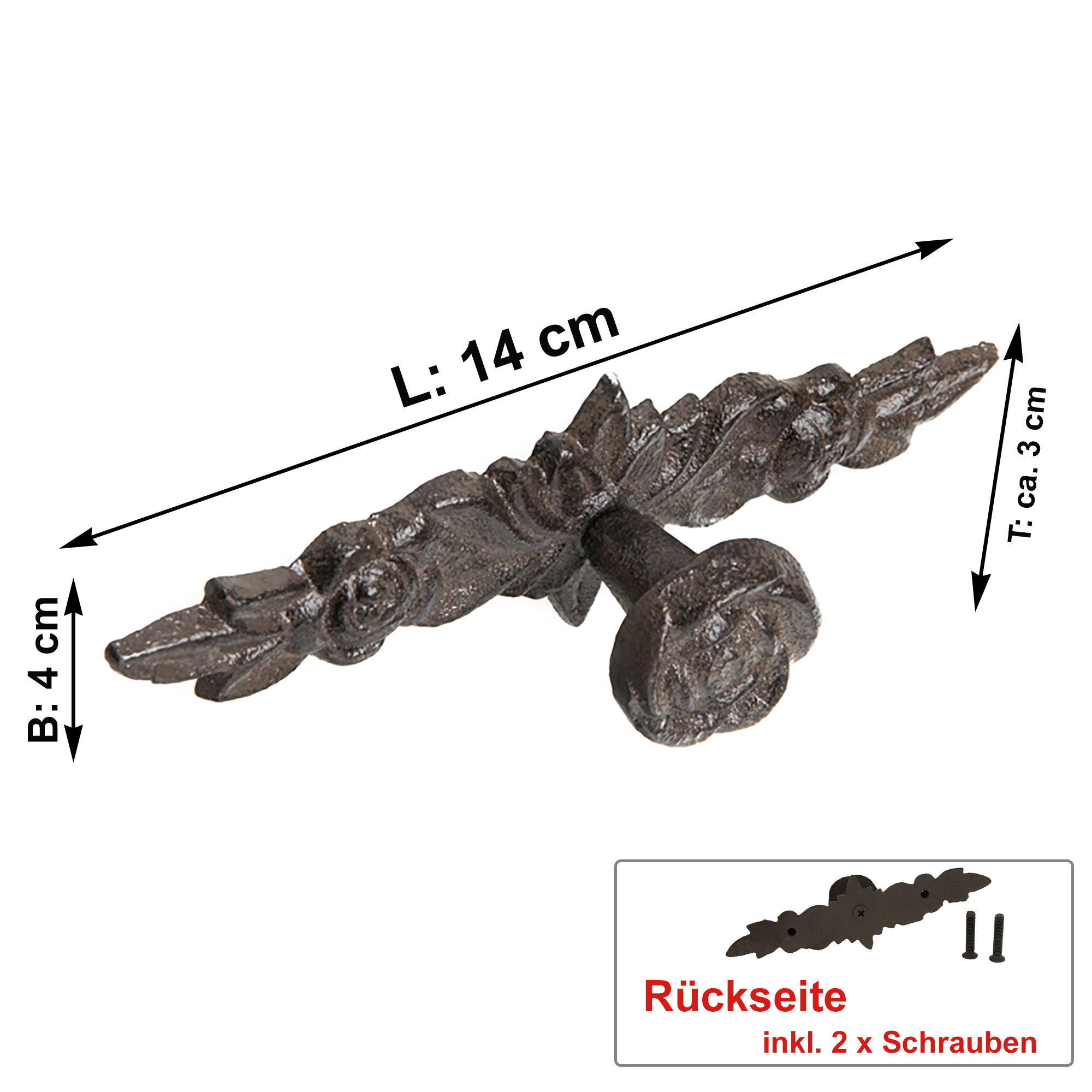 Außergewöhnlich schöner Türgriff aus Gußeisen im nostalgischen Landhaustil mit Vorrichtung zum Schrauben. Die Vintage-Schrankgriffe verleihen jedem Schrank, Regal oder Kommode einen einzigartigen Kontrast und ist garantiert ein einzigartiger Blickfang. Wählen Sie aus unserer schlichten Variante oder dem üppig gestalteten Türgriff, der mit unzähligen Ornamenten verziert ist.