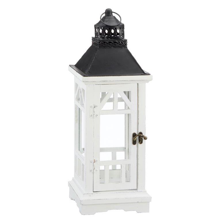 Laterne aus Holz mit Glaseinsatz und farblich passendem Metallaufbau mit Henkel. Die Laterne im Vintage-Look besticht durch seine feudale Eleganz, das weiß lackierte Holz, die stilvollen Holzstreben sowie der extravagante Aufsatz verleihen dieser Laterne ein mondänes Charisma. Dieses außergewöhnliche Deko-Objekt setzt Akzente im Shabby-Chic-Look und wird überall zum Blickfang. Die Holzlaterne findet auf Balkon und Terrasse oder im Haus ihren stilgerechten Standort.