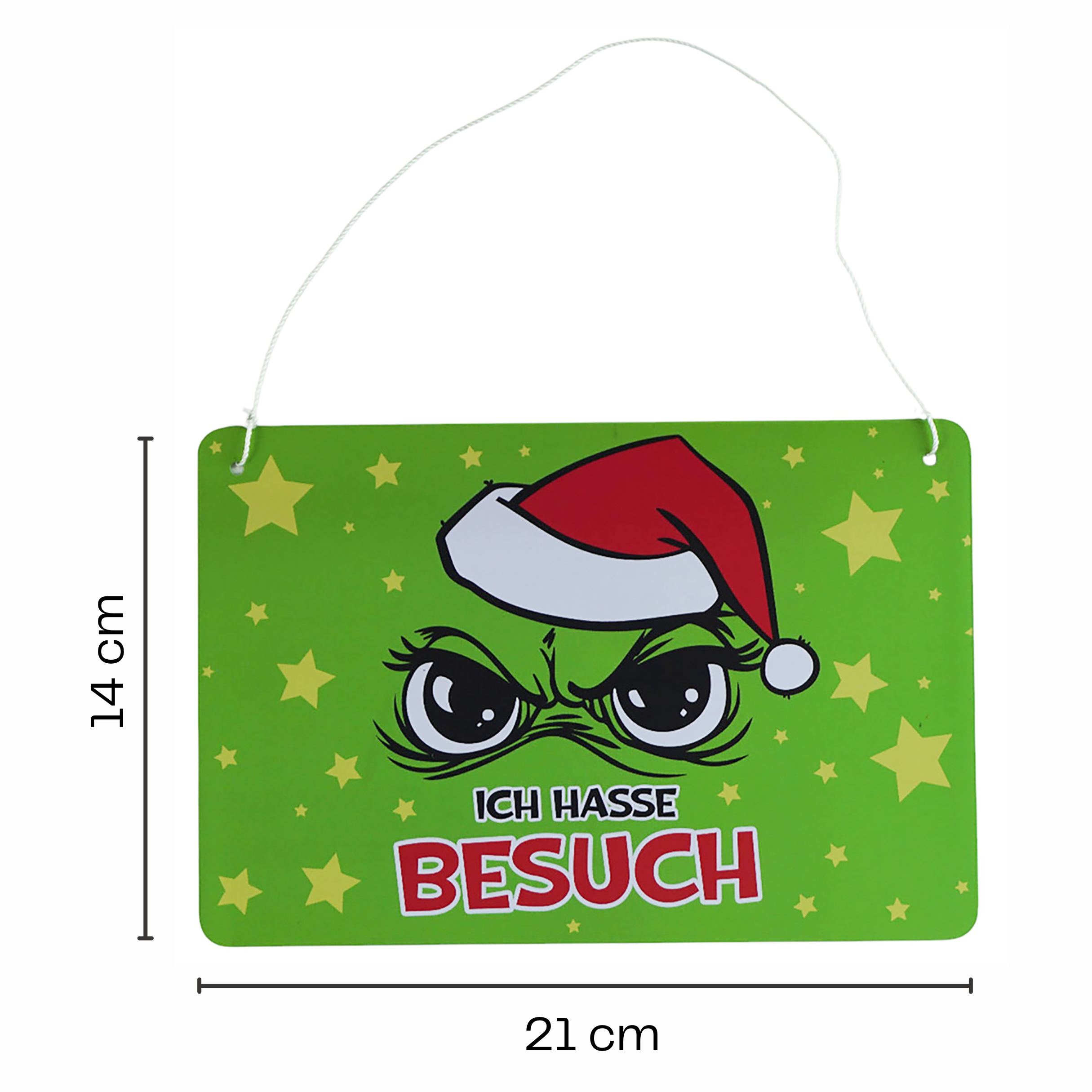 Zeige der Welt mit einem Augenzwinkern, dass du Weihnachten nicht ganz so ernst nimmst! Unsere freche Anti-Weihnachtsdeko in Form von witzigen Schildern bringt garantiert ein Lächeln auf dein Gesicht und sorgt für heitere Stimmung in deinem Zuhause. Mit Sprüchen wie "Ich hasse Besuch" und "Ich hasse Weihnachten" setzt du ein humorvolles Statement, das bei deinen Gästen für Schmunzeln sorgt und gleichzeitig deine ehrliche Meinung widerspiegelt. Die Schilder messen 21 x 14 cm und sind perfekt geeignet, um sie im Eingangsbereich oder in jedem Raum aufzuhängen. Sie kommen im praktischen 2er Set, sodass du gleich zwei originelle Motive zur Auswahl hast. Die Kombination aus witzigem Design und cleveren Sprüchen macht diese Deko zu einem echten Hingucker. Verleihe deiner Weihnachtsdekoration einen einzigartigen Twist! Ob als Geschenk für den Festtags-Muffel in deinem Leben oder als persönliche Note in deinem eigenen Heim – diese Schilder sind vielseitig einsetzbar. Hänge sie über die Tür, an die Wand oder einfach dort auf, wo du ein wenig Humor verbreiten möchtest. Warte nicht länger! Hol dir jetzt dein Set der frechen Anti-Weihnachtsdeko und bringe frischen Wind in die festliche Zeit. Klicke hier und sichere dir deinen Spaßfaktor für die Feiertage.