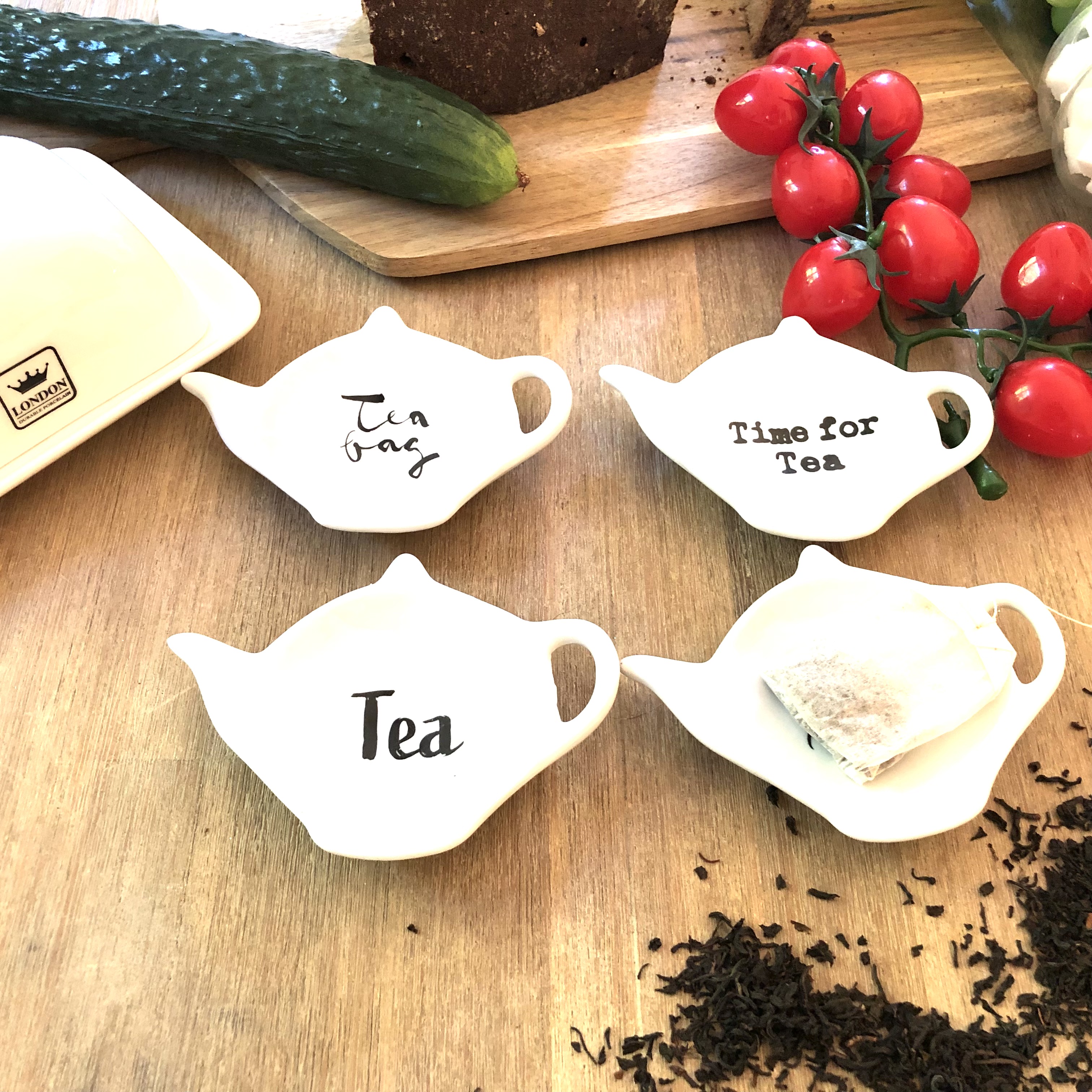 Stilvolle Teebeutelablagen aus weißem Porzellan werdem zum Blickfang auf Ihrem Tisch. Die praktische Teebeutelhalter in Form einer Teekanne mit passendem Aufdruck sind nicht nur ein tolles Tisch-Accessoire, Sie können auch anderweitig zweckentfremdet werden z. B. für Dips, Saucen und vieles mehr.