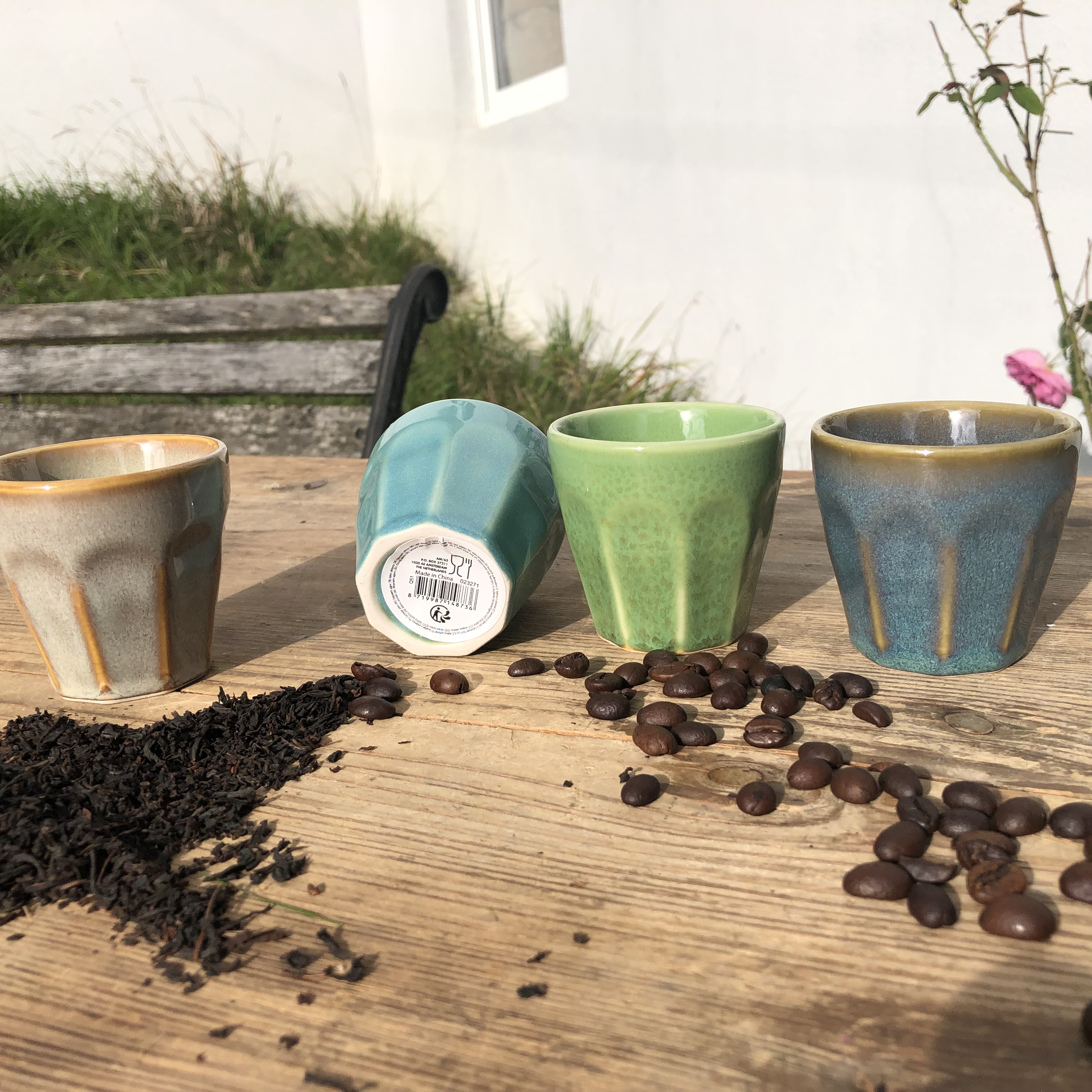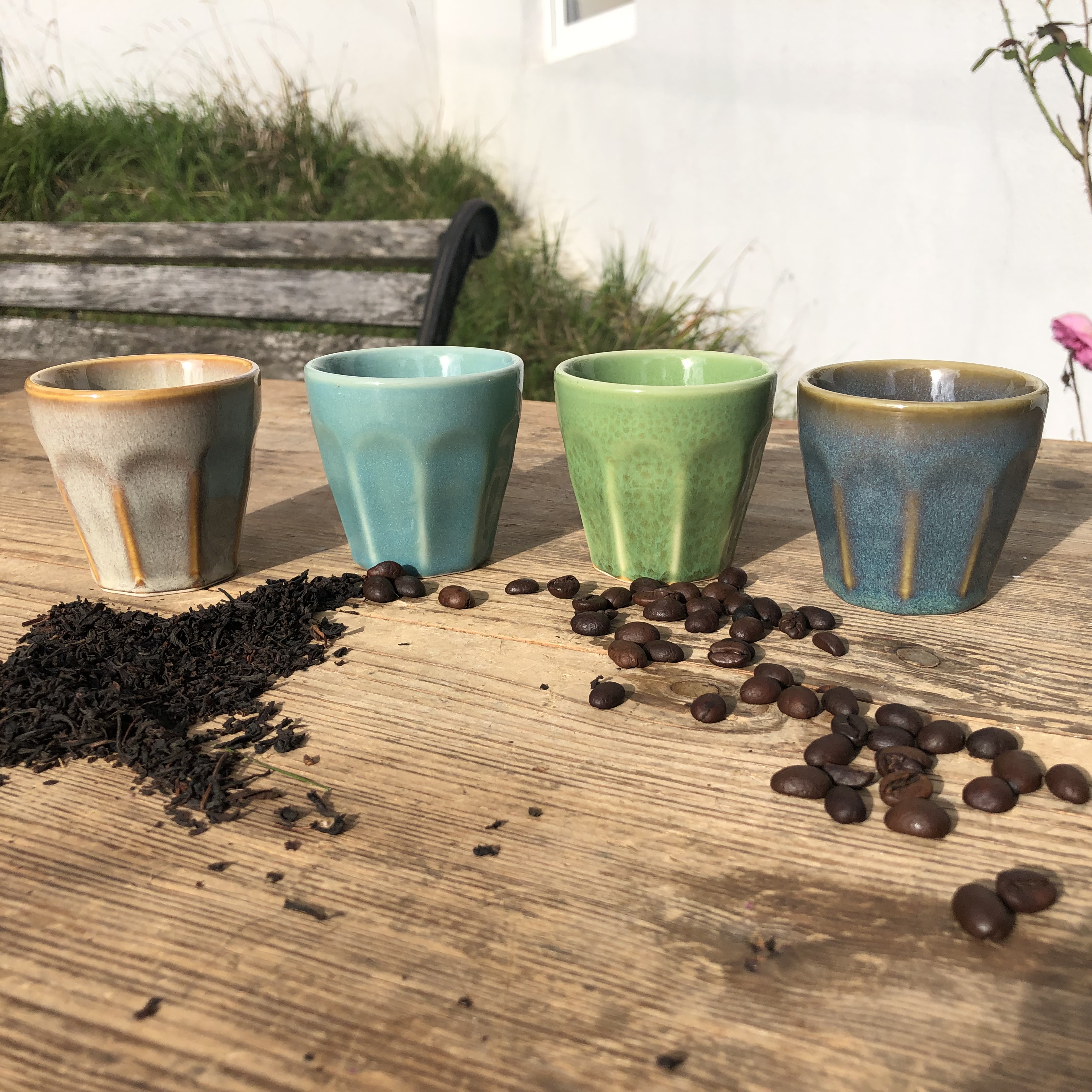 Becher aus Porzellan im handwerklichem Stil. Dank der unterschiedlichen Farben und der tollen Farbverläufe der Tassen sind diese handgearbeiteten Töpferwaren sehr ähnlich. Das 4-tlg. Becher-Set für Espresso, Kaffee, Tee, Kakao oder Cappuccino überzeugt in seiner unverwechselbaren Optik sowie in der Qualität auf ganzer Linie. Die Tassen sind mikrowellengeeignet und können problemlos in der Spülmaschine gereinigt werden. Bei der Herstellung wurde bewußt eine Technik verwendet die einen ausdrucksstarken Vintage-Look erschafft. Die Becher sind aus unterschiedlichen Blickwinkeln und mit unterschiedlicher Belichtung aufgenommen, dadurch können einzelne Bilder leichte, farbliche Unterschiede aufweisen.