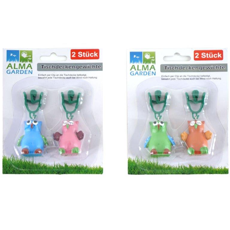 Praktische Tischdeckengewichte im niedlichen Eulendesign. Einfach per Clip an die Tischdecke befestigen, schon bleibt alles an seinem Platz. Ideal für Draußen, im Garten, auf Balkon und Terrasse.
