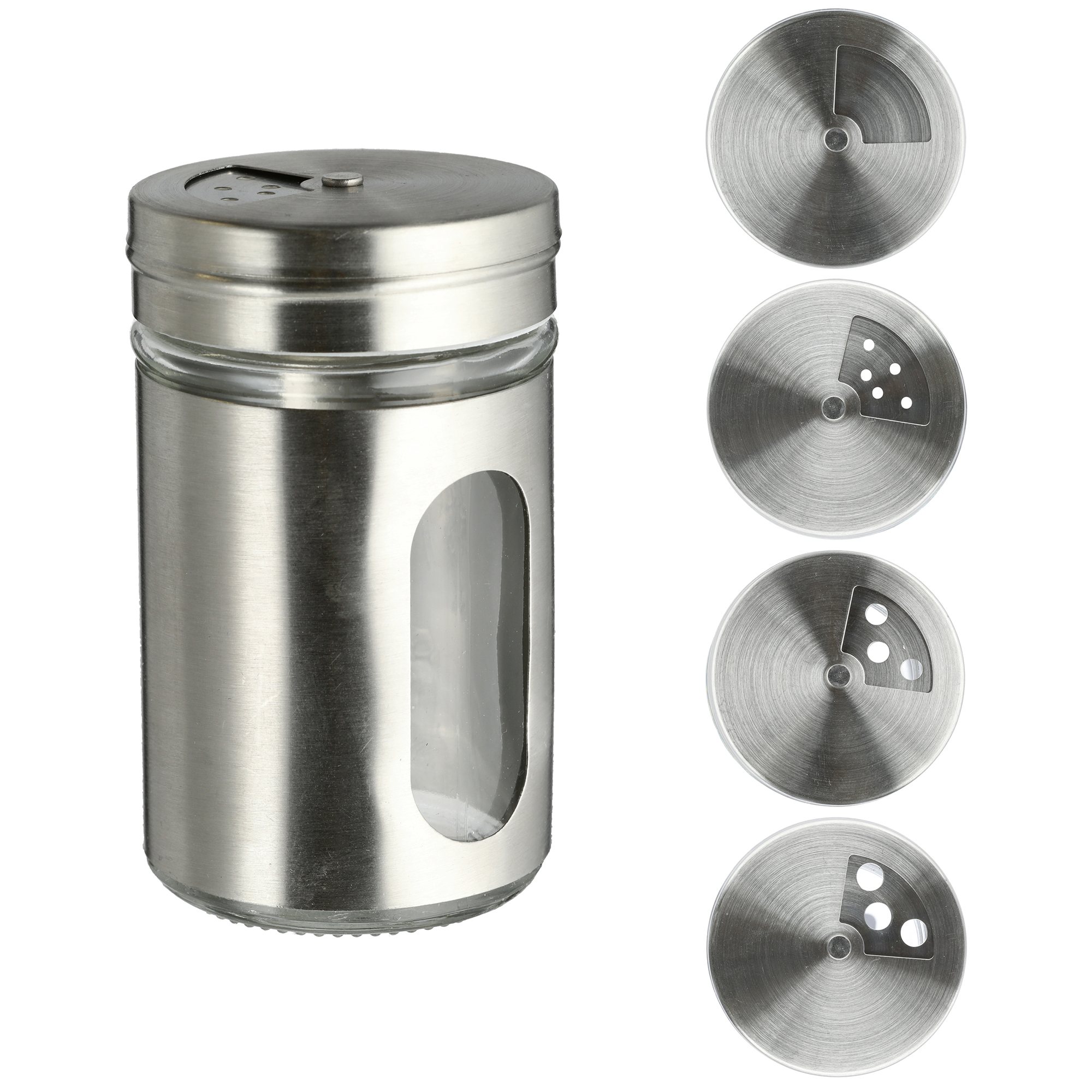 Praktische, kleine Gewürzstreuer aus Glas in stilvoller, silberfarbener Optik mit schicker Edelstahlhülle. Dank des drehbaren Deckel´s und der 3 verschiedenen Streugrößen mit feiner, mittlerer und grober Streuung einfach unverzichtbar. Praktisch mit Sichtfenster auf der Vorderseite...so hat man den Inhalt immer im Blick.