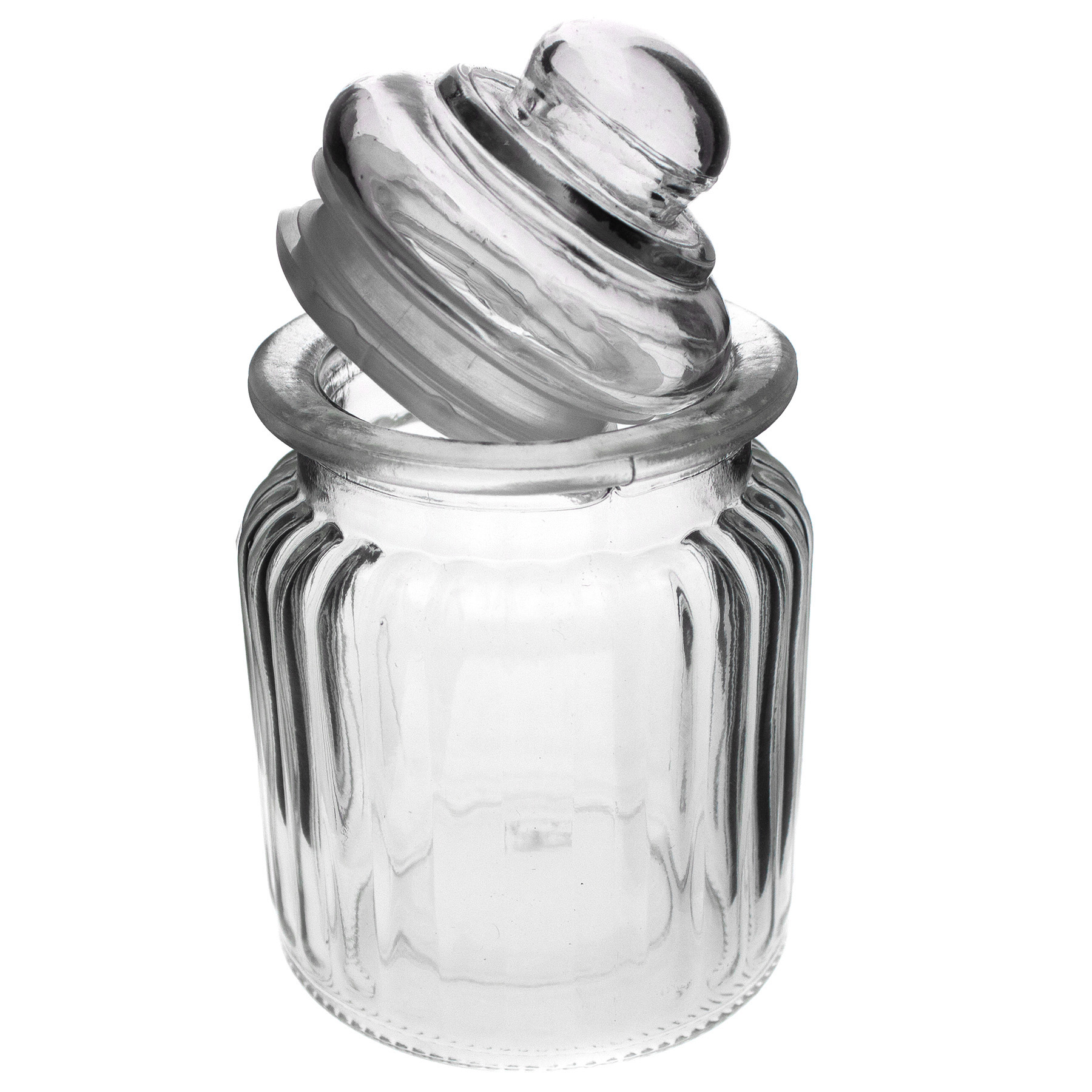 Diese stilvollen Gläser in geriffelter Form mit Deckel aus Glas sind sehr variabel einsetzbar. Die Vorratsgläser haben eine Abdichtung im Deckel, damit Ihre Lebensmittel luftdicht verpackt sind. Ideal als Gewürzgläser, für Süßigkeiten als Bonbonglas oder für Kekse. Auch Bastelutensilien wie Perlen und ähnliches werden gern in den Vorratsbehältern aufbewahrt. Wenn Sie sich für die Variante ohne Deckel entscheiden, können Sie aus den Gläsern im Vintage-Look zauberhafte Windlichter und Blumenvasen kreieren.