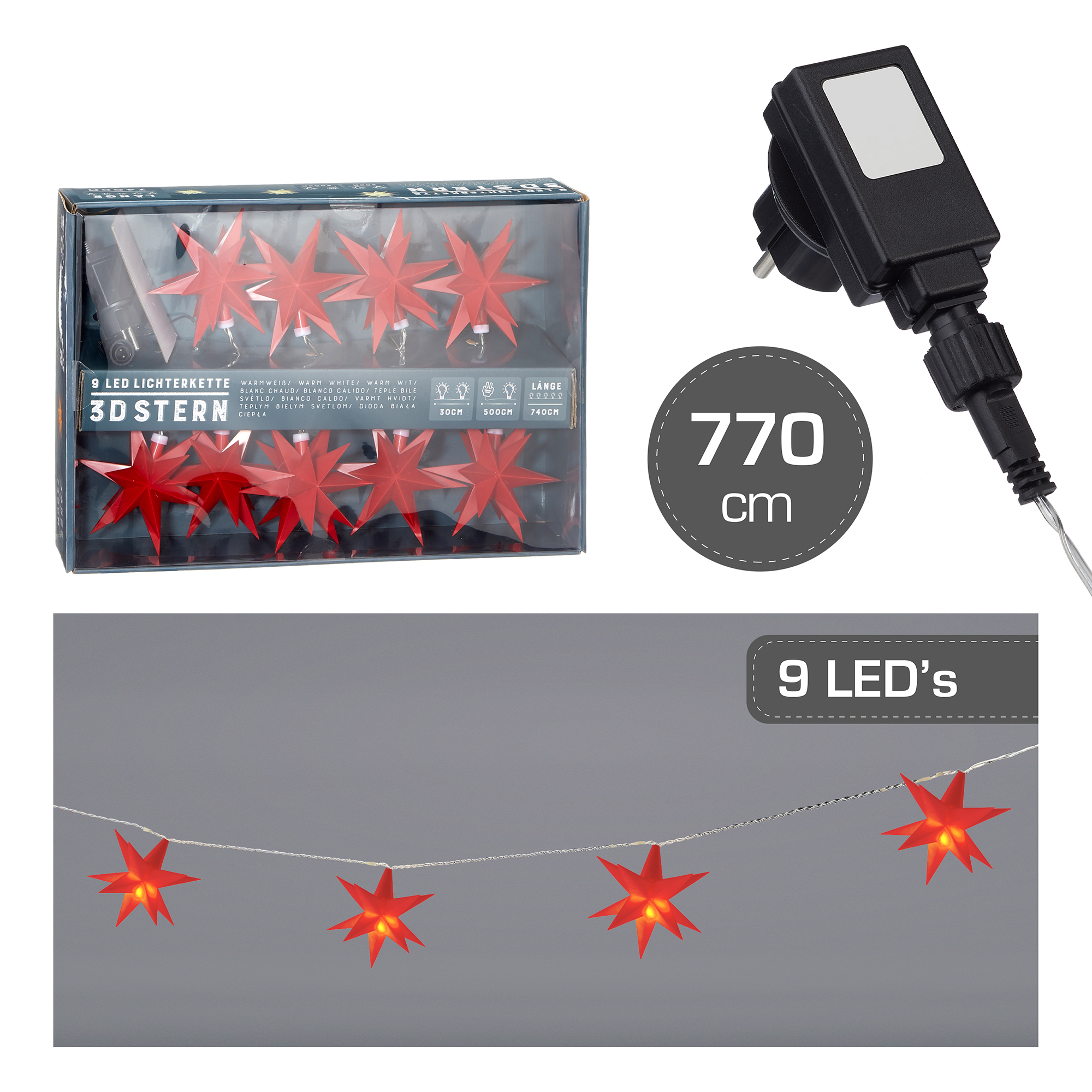 Lichterkette mit Sternen in 3-Dimensionaler Sputnik-Optik mit IP 44 Trafo für den Außenbereich. Die Sterne haben einen Durchmesser von 9 cm und sind mit 12 Zacken gearbeitet. Die Sputnik-Lichterkette verfügt über neun Sterne mit ebenso vielen warmweissen LEDs. Selbstverständlich kann die Lichterkette auch für den Innenbereich benutzt werden. Stimmungsvolles Licht nicht nur in der Weihnachtszeit, auch für Partys und Gartenfeste ein Blickfang.