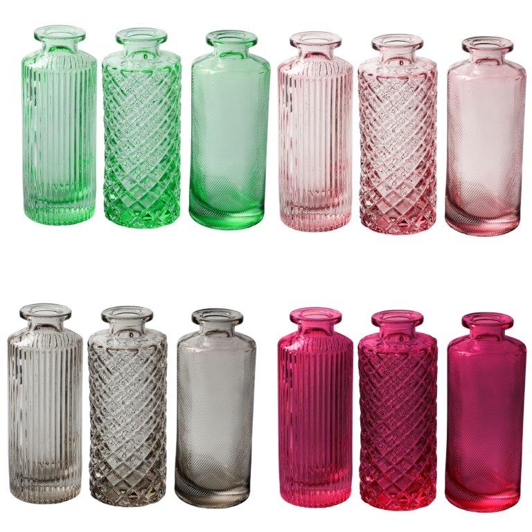 Glasvasen mit stilvoller Glasmusterung im Vintage-Look mit formschöner Optik sehr variabel einsetzbar. Ideal für eine elegante Tischdeko, auch für Festlichkeiten wie Hochzeit, Taufe, Geburtstag und vieles mehr ein exclusiver Blickfang. Die Öffnung bietet Platz für 1-3 Blumen und etwas Deko-Grün, im Set sind drei Modelle für Sie sortiert.