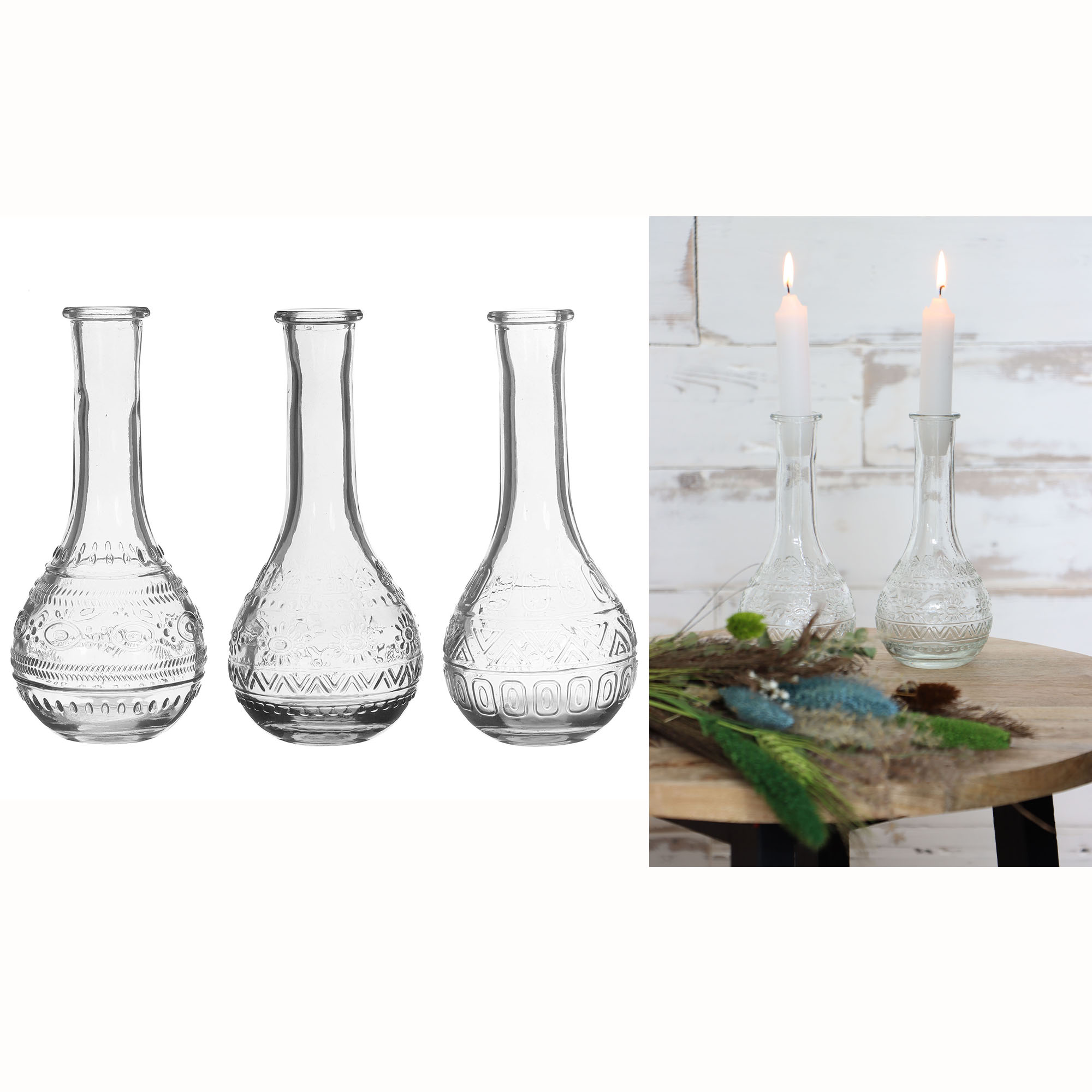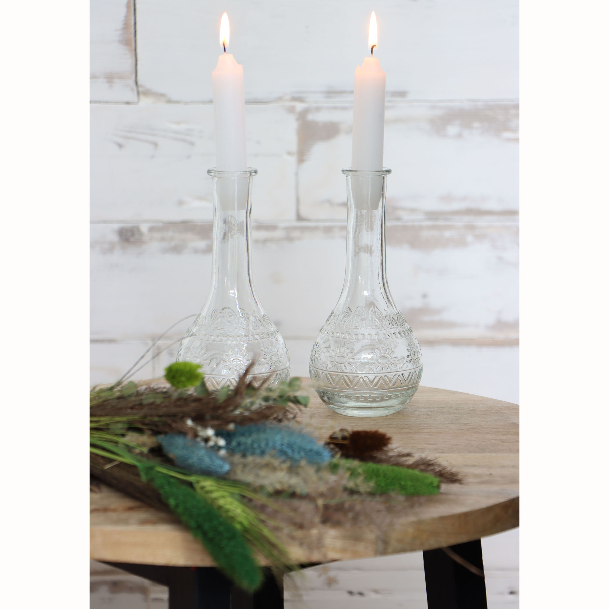 Die Glasvasen sind nicht nur optisch ansprechend, sondern auch äußerst vielseitig einsetzbar. Durch ihr schönes Muster werden sie zu einem echten Blickfang in jedem Raum. Besonders beeindruckend ist ihre Flexibilität: Mit den passenden Dochten können sie im Handumdrehen als Öllampen verwendet werden. Zudem bieten wir auch passende Korkverschlüsse an, sodass die Vasen als Flaschen für Getränke oder Essig und Öl genutzt werden können. In Verbindung mit unseren kleinen Kerzen wird das Dekoglas zudem zu einem eleganten Kerzenhalter aus Glas umfunktioniert. Die Vielseitigkeit der Glasvasen macht sie zu einer idealen Ergänzung für jede Einrichtung. Ihr ansprechendes Design fügt sich harmonisch in jeden Raum ein und zieht alle Blicke auf sich. Die Möglichkeit, sie sowohl als Öllampe als auch als Flasche zu verwenden, zeigt ihre praktische Anpassungsfähigkeit an verschiedene Bedürfnisse. Darüber hinaus verleiht die Umwandlung des Dekoglases in einen edlen Kerzenständer dem Ambiente eine romantische Atmosphäre und sorgt für gemütliches Licht im Wohnraum. Die hochwertige Verarbeitung aus Glas und Metall unterstreicht dabei den stilvollen Charakter dieser multifunktionalen Vasen. Insgesamt bieten die Glasvasen somit nicht nur eine dekorative Bereicherung für Zuhause, sondern überzeugen auch durch ihre Funktionalität und Wandlungsfähigkeit - ein Must-have für alle Liebhaber von stilvollem Interior-Design!