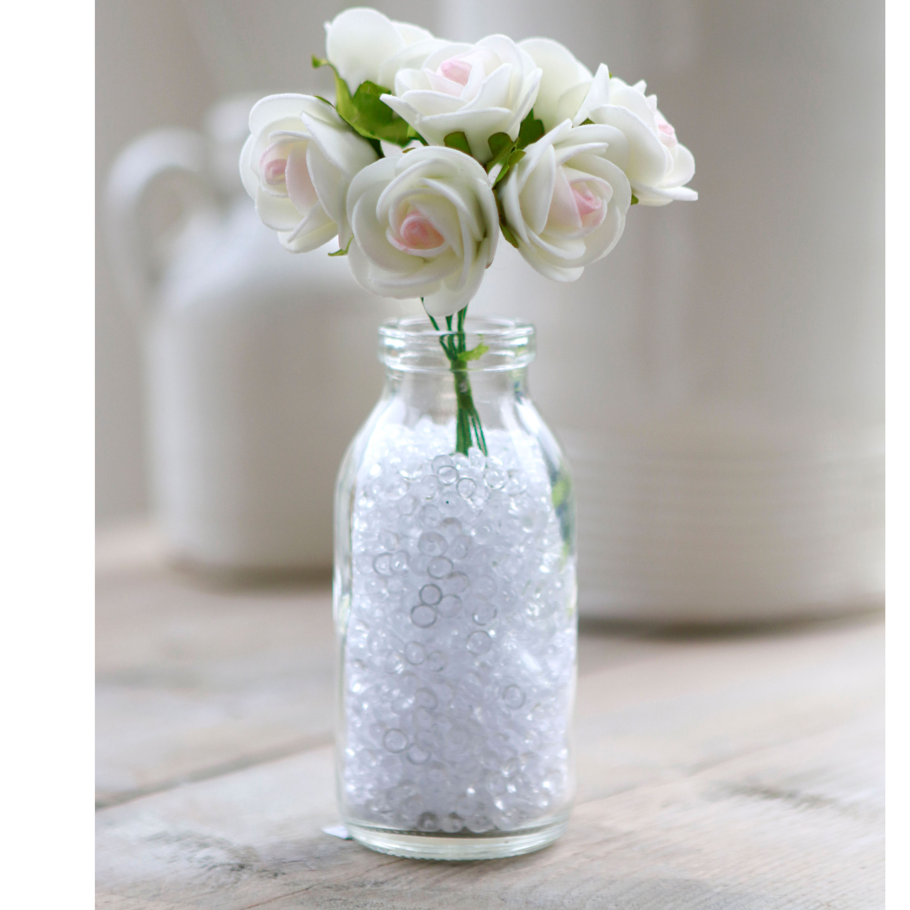 Glasfläschchen im Landhausstil für unzählige Zwecke einsetzbar. Ideal als kleine und preiswerte Tischvasen für den stilvoll gedeckten Tisch. Auch mit Sand und Muscheln oder Trockenblumen ein bezaubernder Blickfang.