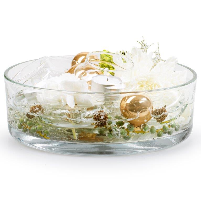 Stilvolle Glasschale aus massivem und hochwertigem Glas für unzählige Dekorationen geeignet. Mit Schwimmgläser und Teelichter ein unbeschreiblicher Blickfang...oder mit Sand und Muscheln als maritime Deko. Selbstverständlich kann die Glasschale je nach Jahreszeit saisonal immer wieder anders dekoriert werden.