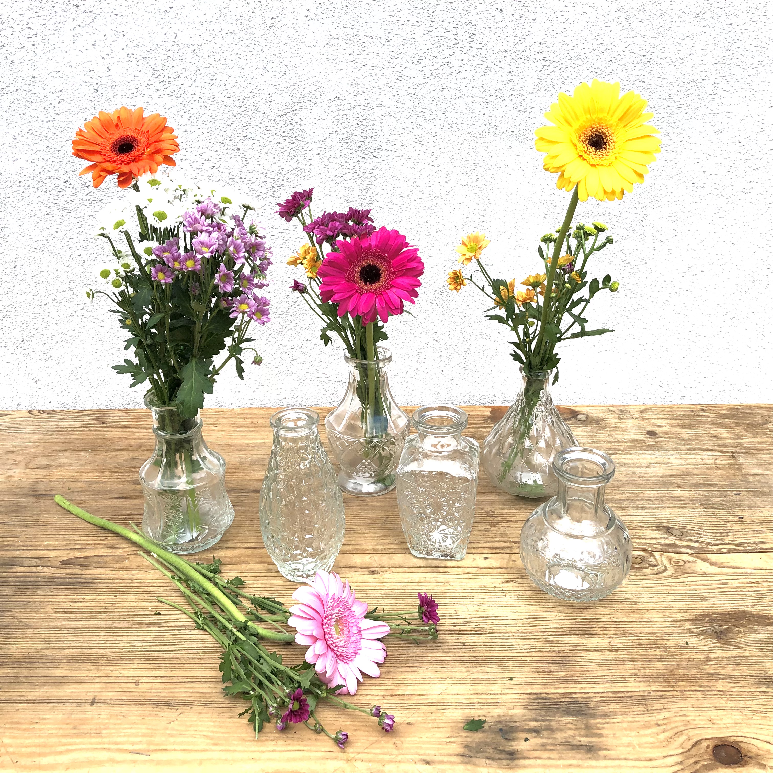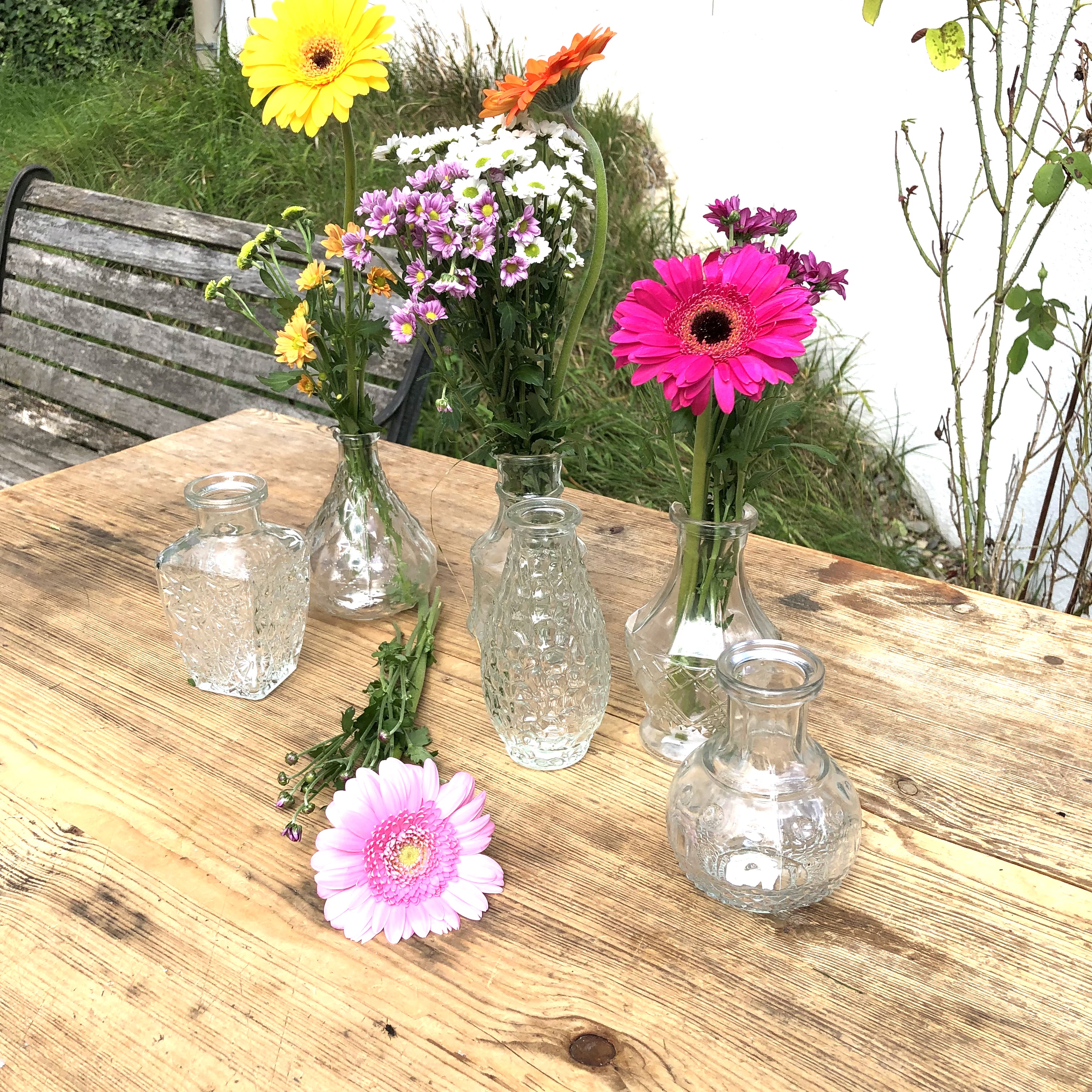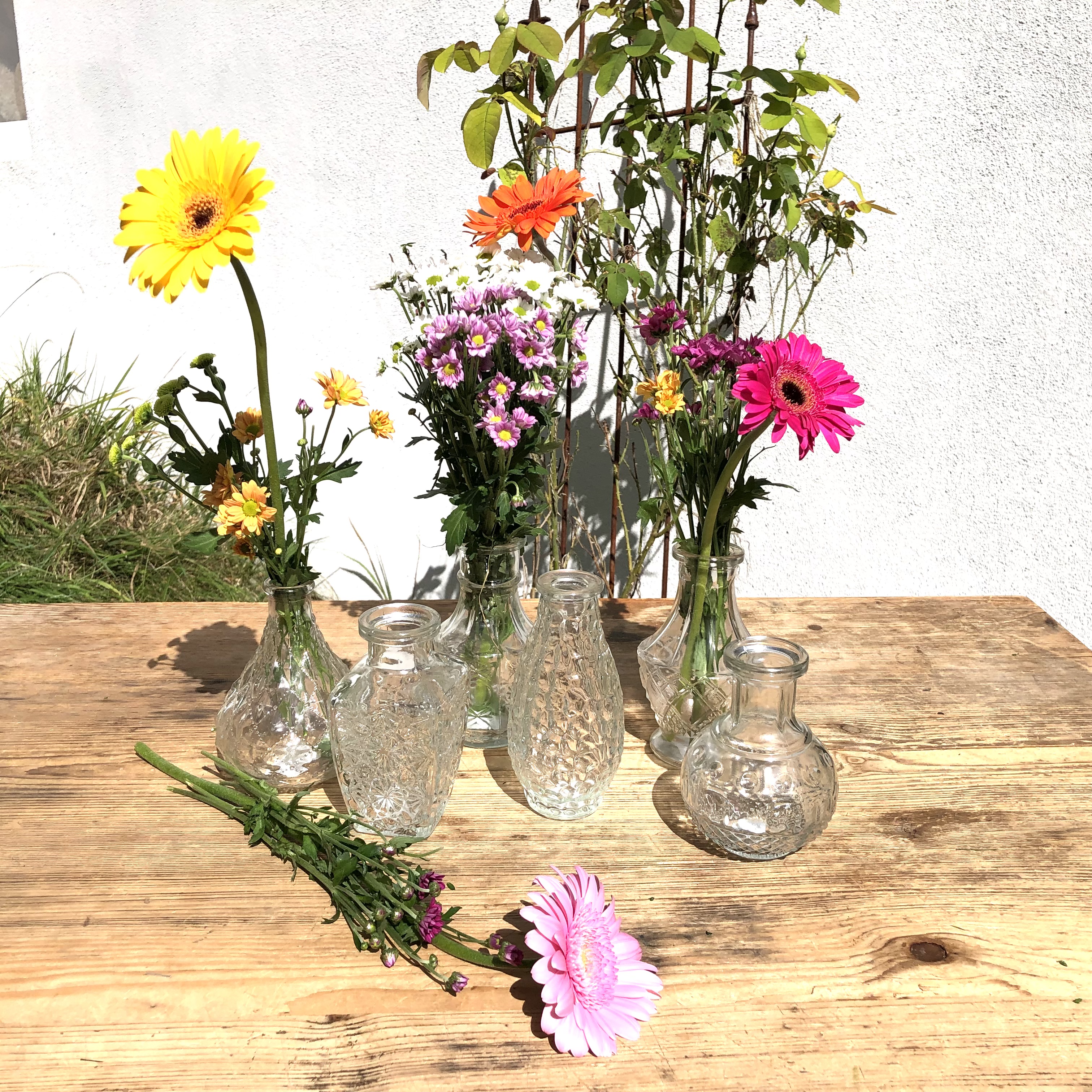 Stilvolle Vasen aus Glas im bezaubernden Vintage-Look mit außergewöhnlich schönen Formen und Mustern. Mit ein oder zwei Blüten und etwas Gras oder Schleierkraut werden diese Tischvasen zum dekorativen Blickfang. In den Sets sind jeweils 6 Vasen in verschiedenen Modellen je nach Verfügbarkeit enthalten. Die kleinere Variante der Glasvasen hat eine Höhe von 12 - 14 cm, die größere Variante der Blumenvasen sind zwischen 14,8 bis 20 cm hoch.