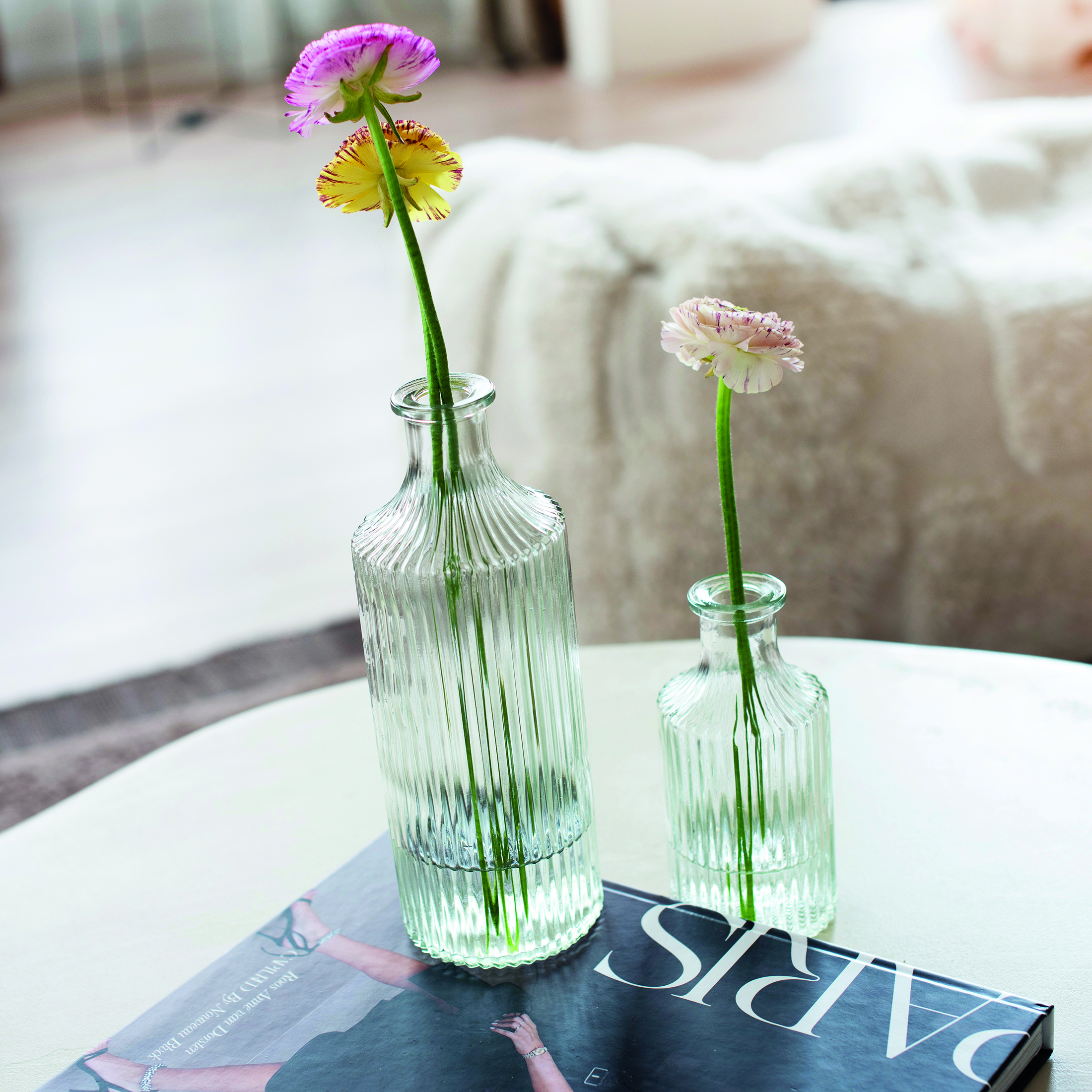 Unbeschreiblich schöne Vasen aus Glas im Vintage-Look mit herrlich schimmernder Glasmusterung, stilsicher und mondän für die Tischdeko. Ideal als einzigartige Vase bei Hochzeiten und vielen anderen Feierlichkeiten. Auch als Dekoflasche ein bezaubernder Blickfang.