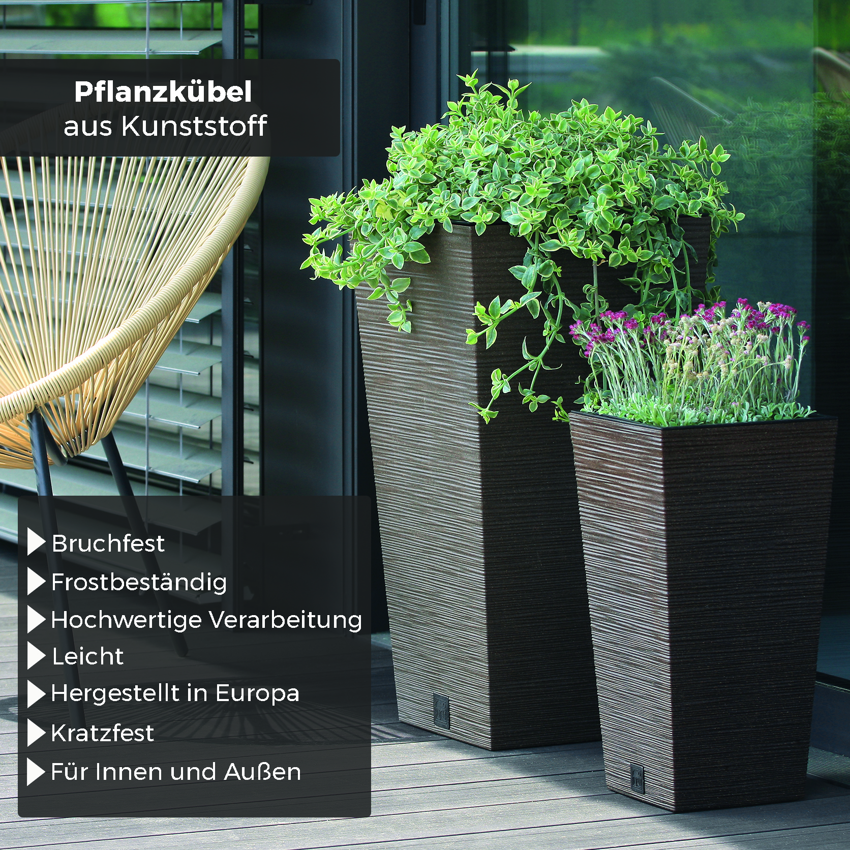 Die Pflanzsäule ist nicht nur äußerst dekorativ, sondern auch praktisch und vielseitig einsetzbar. Dank des wetterfesten Kunststoffs können Sie die Pflanzsäule sowohl drinnen als auch draußen verwenden. Egal ob auf Ihrer Terrasse, dem Balkon oder im Wohnzimmer - sie fügt sich harmonisch in jede Umgebung ein und verleiht Ihrem Zuhause einen Hauch von Eleganz. Die hochwertige Verarbeitung des Rattan-Looks lässt die Säule besonders edel wirken. Das natürliche Flechtmuster sorgt für eine ansprechende Optik und lädt zum Wohlfühlen ein. Gleichzeitig bietet der robuste Kunststoff Schutz vor Wind und Wetter, sodass Ihre Blumen- oder Grünpflanzen stets gut geschützt sind. Mit den verschiedenen Größen haben Sie zudem die Möglichkeit, Ihre individuelle Gestaltungsidee umzusetzen. Ob einzeln platziert oder als Ensemble arrangiert – diese Pflanzsäulen werden garantiert alle Blicke auf sich ziehen! Darüber hinaus punktet das Produkt mit seiner einfachen Handhabung: Dank eines integrierten Wasserablaufsystems wird überschüssiges Regenwasser problemlos abgeführt, ohne dass es zu Staunässe kommt. So bleiben Ihre Lieblingspflanzen immer optimal versorgt und gedeihen prachtvoll. Überzeugend ist außerdem das Preis-Leistungs-Verhältnis dieser stilvollen Pflanzsäulen aus wetterfestem Kunststoff-Rattan-Look. Sie erhalten nicht nur qualitativ hochwertige Produkte, sondern auch ein Stück Gemütlichkeit und Eleganz für Ihr Zuhause. Entscheiden Sie sich jetzt für diese Pflanzsäule in stilvollem Rattan-Look aus wetterfestem Kunststoff und schaffen Sie eine angenehme Atmosphäre, die Ihre Gäste beeindrucken wird. Den Kunststoffeinsatz können Sie bequem herausheben, die Pflanzschale lässt sich so sehr einfach bepflanzen und Sie müssen nicht den gesamten Blumenkübel befüllen.