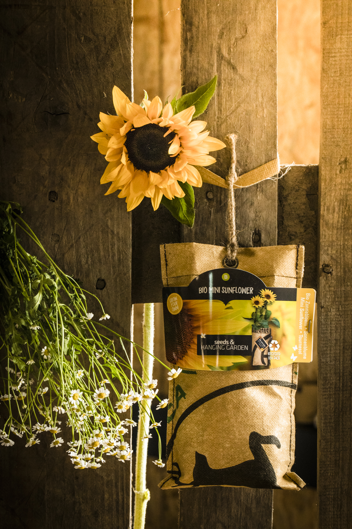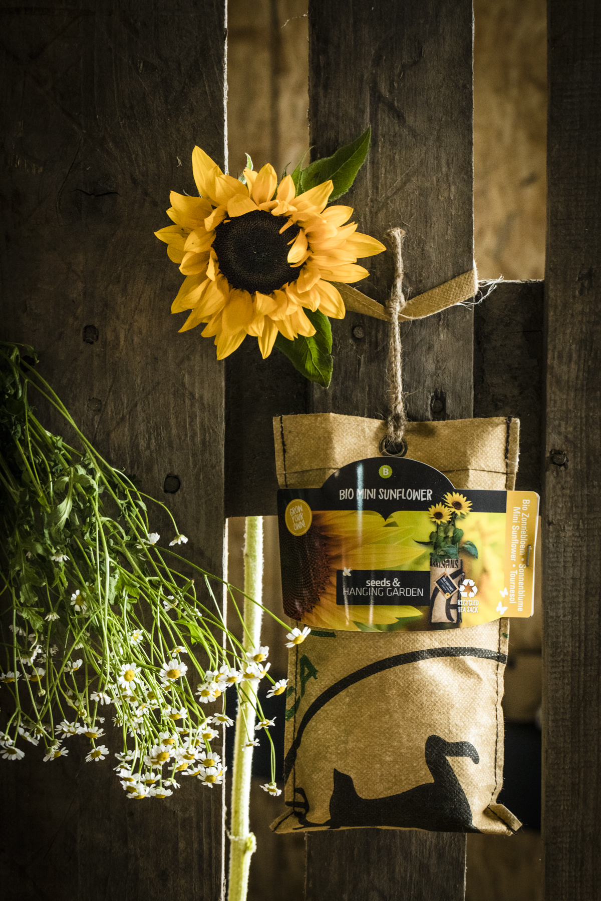 Produktinformationen "Hängende Gärten "Sonnenblume" in recyelten Teesäcken - 23 x 12 cm (H/B)"