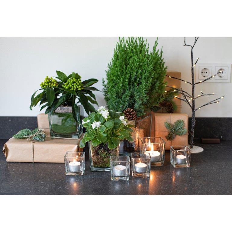 Die eleganten Glaswürfel bestechen durch ihre hochwertige Verarbeitung und das schwere, robuste Glas. Als Windlichter für Teelichter sorgen sie für eine stimmungsvolle Atmosphäre in Ihrem Zuhause. Doch die vielseitigen Würfel können noch viel mehr! Lassen Sie Ihrer Kreativität freien Lauf und verwenden Sie sie auch als stilvolle Behälter für Vorspeisen oder Desserts. Mit den edlen Glasgefäßen sind Ihnen keine Grenzen gesetzt. Arrangieren Sie einzelne Blumen darin und verwandeln Sie Ihren Tisch in einen wahren Blickfang. Die klaren Linien der Würfel harmonieren perfekt mit jedem Einrichtungsstil – sei es modern, klassisch oder minimalistisch. Entdecken Sie jetzt die Vielfalt der Einsatzmöglichkeiten dieser stilvollen Glasschätze und lassen Sie Ihr Zuhause erstrahlen! Stilvolle Glaswürfel von hoher Qualität eignen sich hervorragend als stimmungsvolles Windlicht mit Teelichten. Diese schönen Würfel können auch zur Präsentation von Vorspeisen oder Desserts verwendet werden - ihrer Fantasie sind dabei keine Grenzen gesetzt! Auch einzeln platzierte Blumen machen diese Glaskunstwerke zu einem absoluten Hingucker auf Ihrem Tisch. Dank ihres massiven Gewichts eigenen sich diese kleinen quadratischen Glaskörper ideal als schicke und preisgünstige Dekorationselemente. Die eleganten Glaswürfel bestechen durch ihre hochwertige Verarbeitung und das schwere, robuste Glas. Als Windlichter für Teelichter sorgen sie für eine stimmungsvolle Atmosphäre in Ihrem Zuhause. Doch die vielseitigen Würfel können noch viel mehr! Lassen Sie Ihrer Kreativität freien Lauf und verwenden Sie sie auch als stilvolle Behälter für Vorspeisen oder Desserts. Mit den edlen Glasgefäßen sind Ihnen keine Grenzen gesetzt. Arrangieren Sie einzelne Blumen darin und verwandeln Sie Ihren Tisch in einen wahren Blickfang. Die klaren Linien der Würfel harmonieren perfekt mit jeder Einrichtungsstil – sei es modern, klassisch oder minimalistisch.