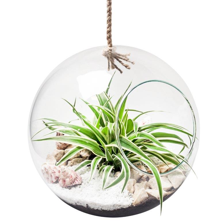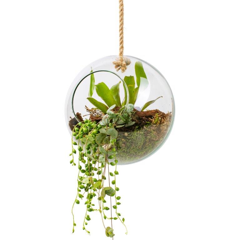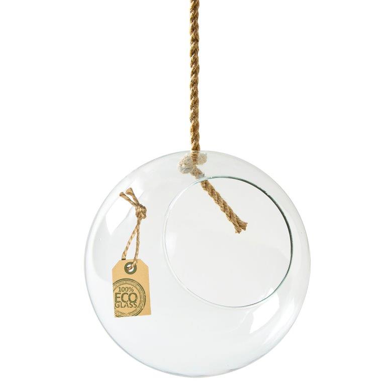 Mit dieser dekorativen Vase mit stabilem Seil zum Hängen kreieren Sie im Handumdrehen einen außergewöhnlichen Blickfang. Das Glasgefäß können Sie saisonal immer wieder anders ausgestalten. Bezaubernd mit Erde, Steinen und Pflanzen, stilvoll mit Sand und Teelicht, Trockenblumen und vielem mehr. Das Pflanzterrarium ist überall ein extravaganter Hingucker.