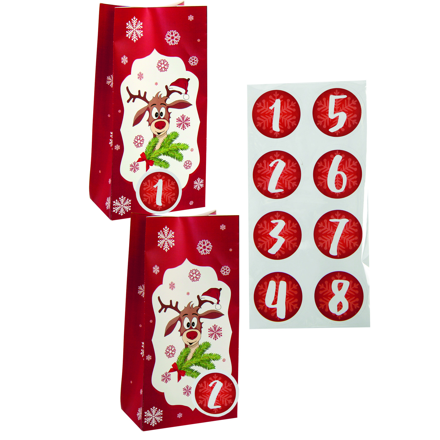 Süsse Papiertüten mit niedlichen Elch "Didi" bedruckt und Zahlen von 1 - 24 zum Aufkleben. Die kleinen Tüten haben eine praktische Bodenfalte und können so überall aufgestellt werden.