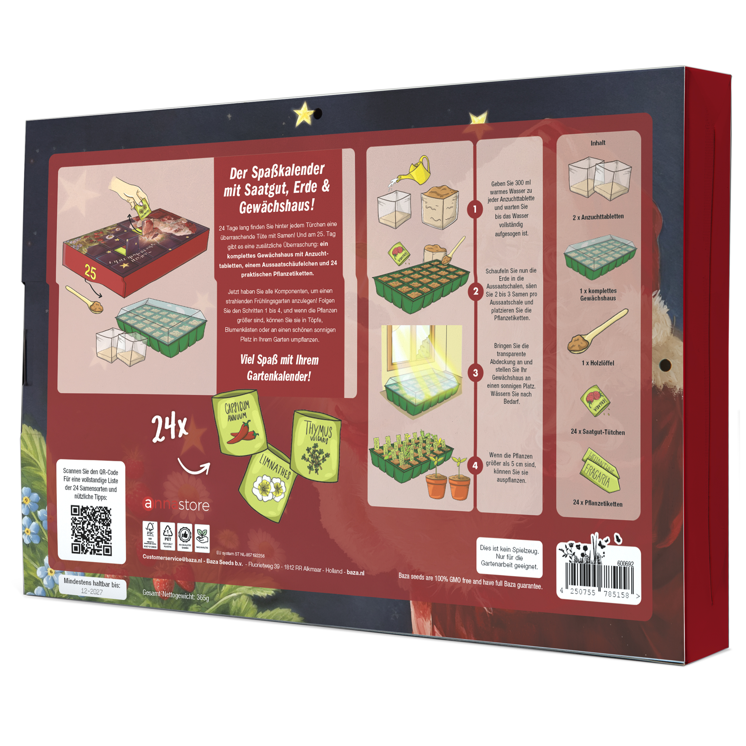 Die 24 Samenarten Adventskalenders: Eisblume, Lathyrus Byou, Spiegelei, Kapuzinerkresse, “Vergissmeinnicht”, Zinnia elegans, Sonnenblume niedrig, Riesensonnenblume, Walderdbeere, Frühlingszwiebeln, Zuchini, Marketmore-Gurke, Kopfsalat, Cayennepfeffer, Rucola, Chinabohnen Mirage, Tomate "Moneymaker", Großblättriges Basilikum, Dill, Estragon, Kamille, Petersilie, Thymian, Kresse.
