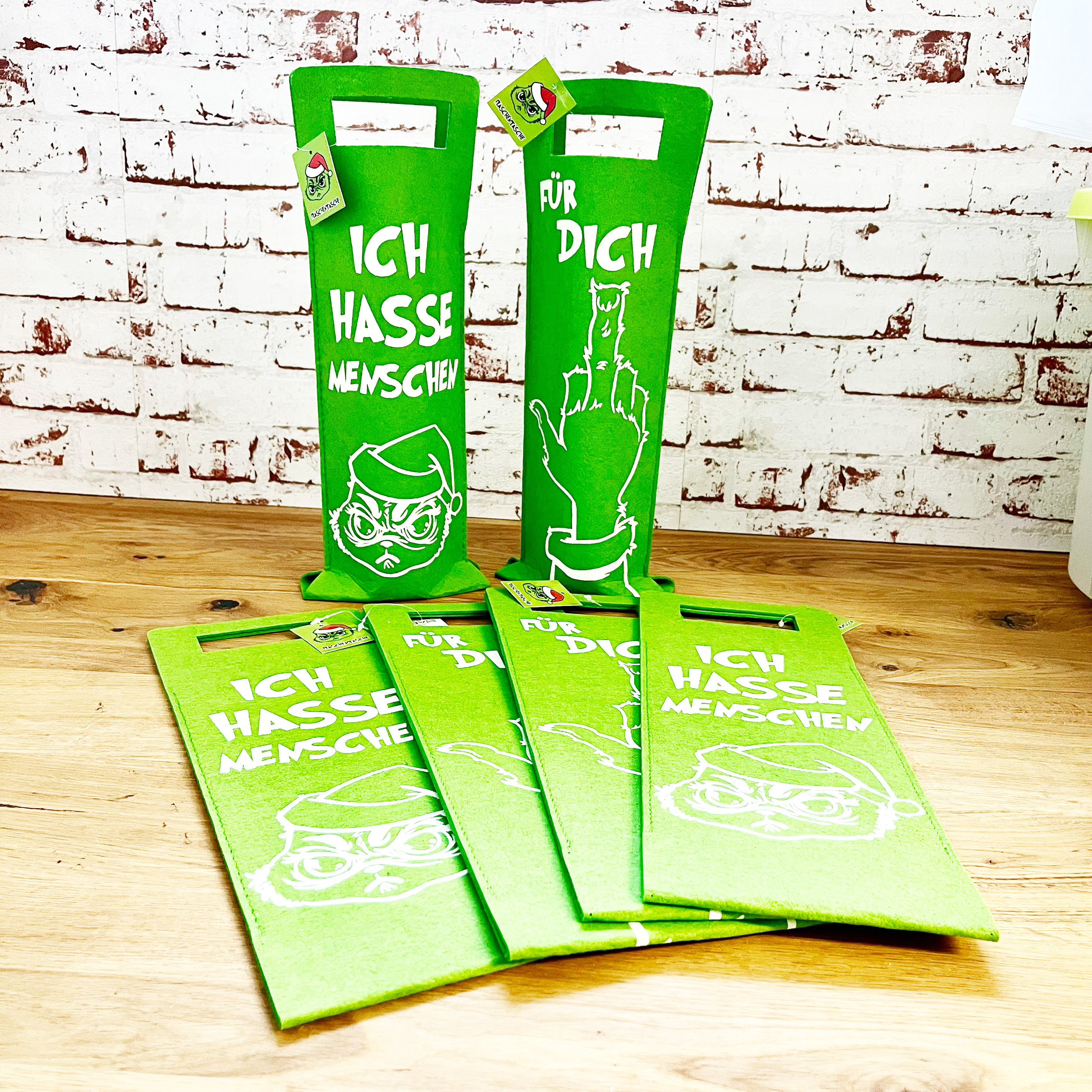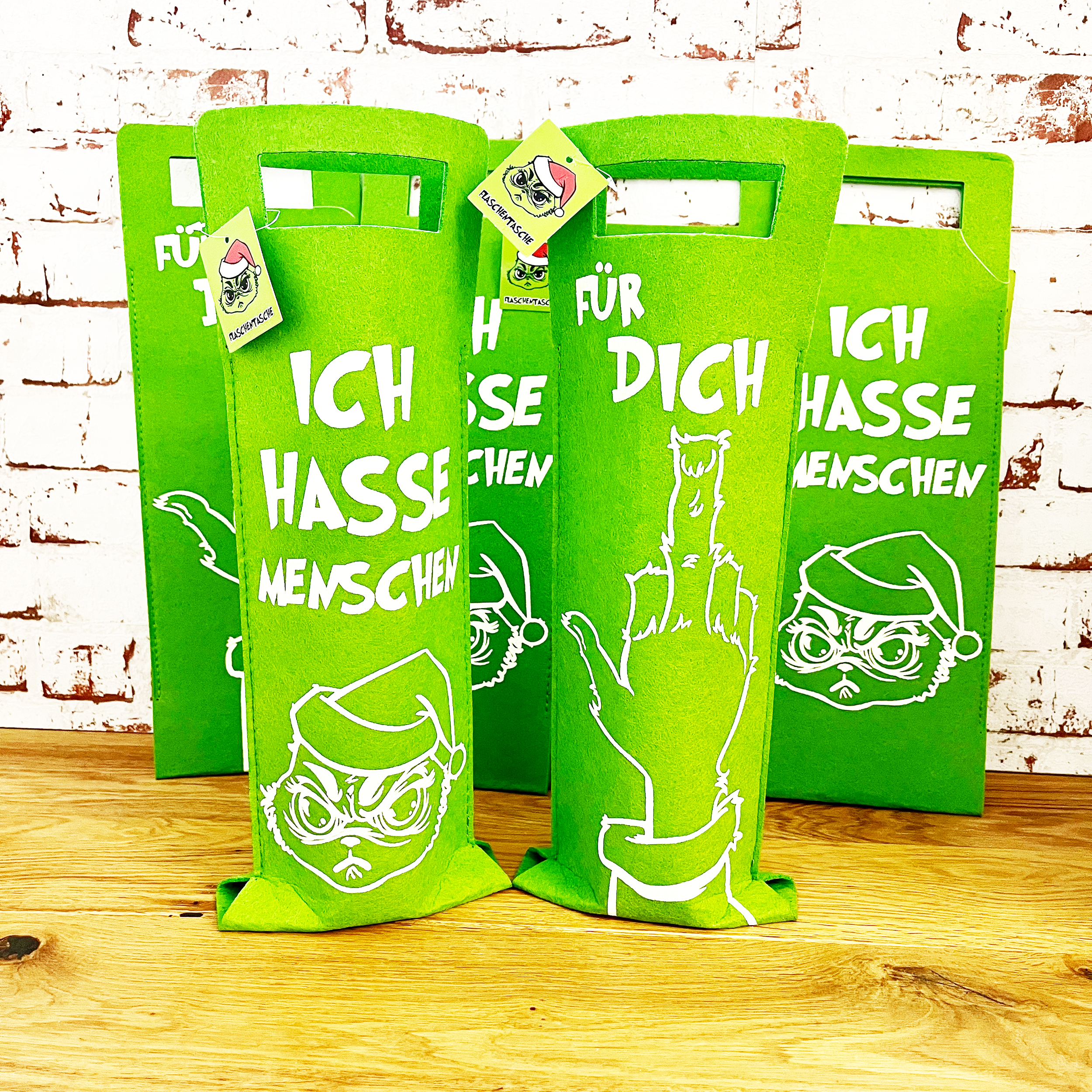 Unsere frechen Flaschentaschen "Festtags-Muffel" sind die perfekte Verpackung für alle, denen Weihnachten so richtig auf die Nerven geht. Mit dem Anti-Weihnachts-Design "Ich hasse Menschen" und dem Aufdruck eines Stinkefingers kannst du deine Abneigung gegenüber der fröhlichen Weihnachtszeit auf lustige Art zum Ausdruck bringen. Die Festtags-Muffel Flaschentaschen aus grünem Filz sind in zwei Modellen erhältlich und sorgen garantiert für ein Schmunzeln. Sie sind die ideale Geschenkverpackung für alle, die Weihnachten nicht allzu ernst nehmen. Zeige deinen Freunden und Verwandten mit diesen frechen Flaschentaschen, dass du auch in der Adventszeit deinen Humor nicht verlierst. Hol dir jetzt unsere einzigartigen Flaschentüten "Festtags-Muffel" und verbreite gute Laune in der festlichen Zeit.