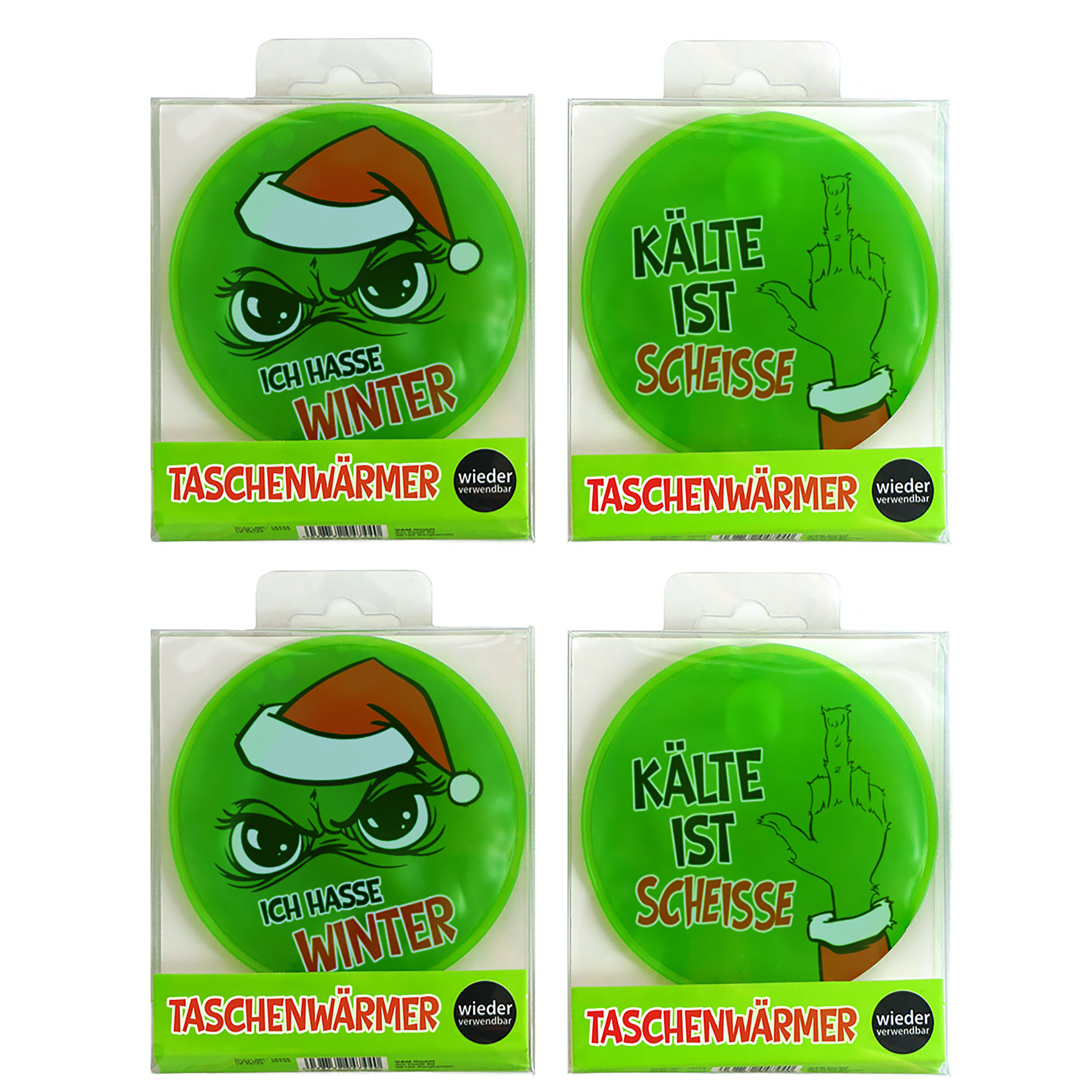 Willkommen zu unserem neuen Produkt - den festlichen Taschenwärmern für alle Weihnachtsmuffel da draußen! Mit ihrem knalligen giftgrünen Design und dem frechen Spruch "Ich hasse Winter" und " Kälte ist Scheiße" sind diese Taschenwärmer nicht nur ein echter Hingucker, sondern auch ein praktischer Begleiter in der kalten Jahreszeit. Egal ob beim Winterspaziergang oder im Fußballstadion - mit diesen trendigen Taschenwärmern bleibst du garantiert warm. Die Handwärmer bestehen aus hochwertigem Kunststoff und haben einen Durchmesser von 8,5 cm. Einfach das Metallplättchen knicken und schon werden die Taschenwärmer warm. Und das Beste: Du kannst sie bis zu 1000 mal wieder aufladen, indem du sie einfach für einige Minuten in heißes Wasser legst. Also, lass dich von unserer Festtags-Muffel Kollektion überzeugen und hol dir jetzt deine witzigen Taschenwärmer, die dich nicht nur warm halten, sondern auch jedes Mal ein Lächeln auf dein Gesicht zaubern werden. Mach dich bereit für die kalte Jahreszeit mit unseren einzigartigen Taschenwärmern!