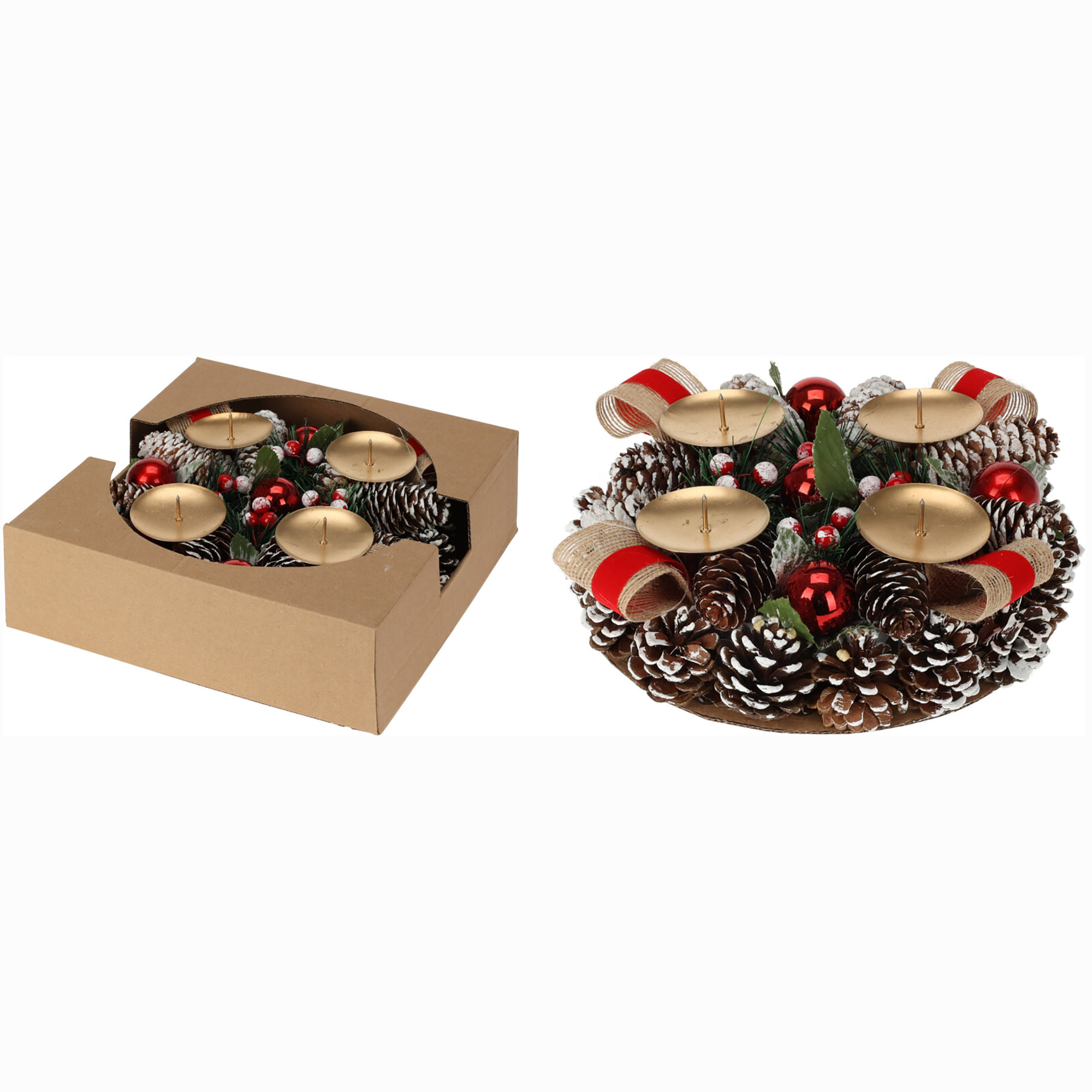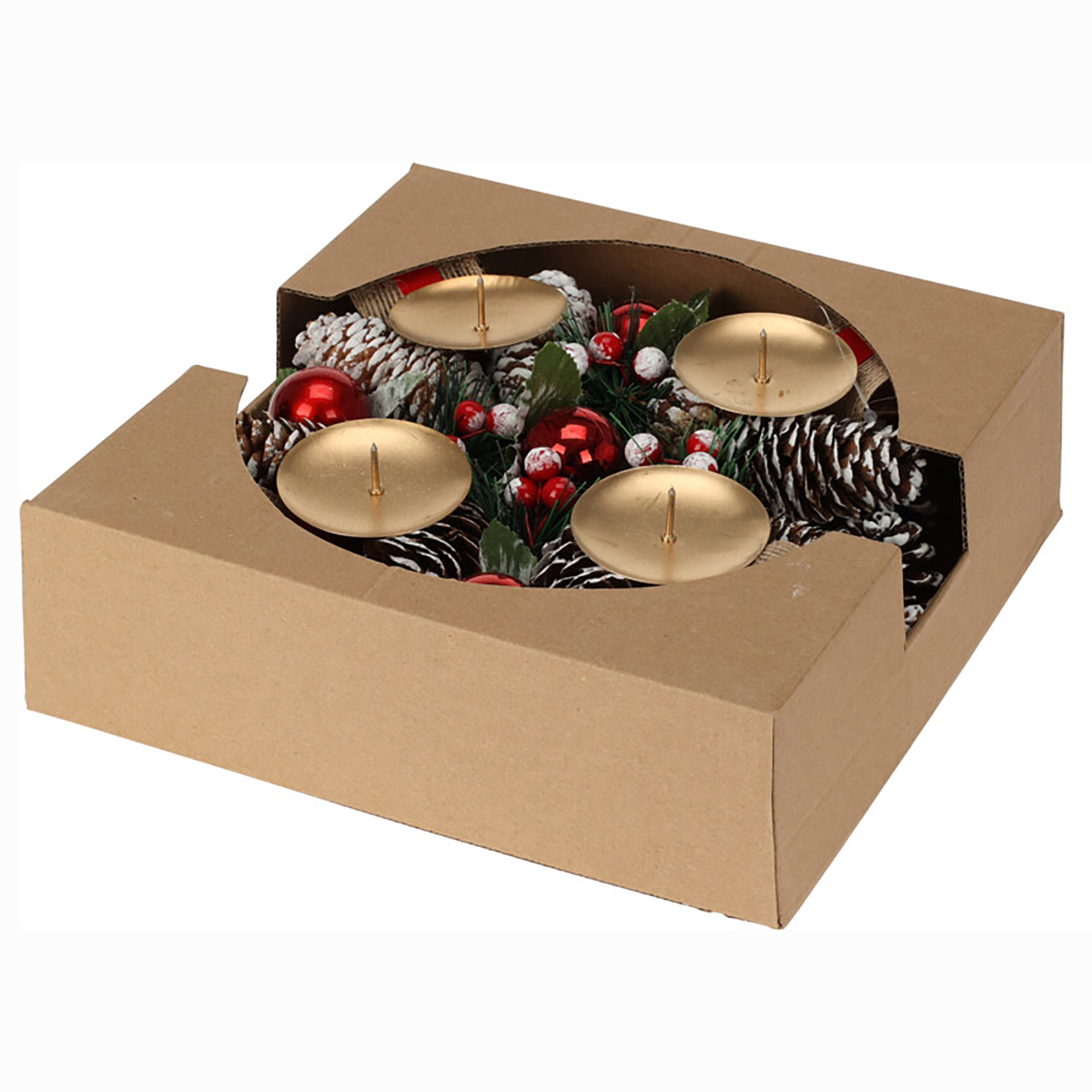 Wunderschöner Adventskranz, bereits aufwendig für Sie fertig geschmückt, inklusive 4 x Kerzentellern. Der Kranz ist aufwendig mit echten Tannenzapfen, Beeren, Schleifen und Weihnachtskugeln toll dekoriert, so kann die Weihnachtszeit kommen. Unverzichtbar für die adventliche Deko, so kommt stimmungsvolle Atmosphäre in Ihr Zuhause. Ebenfalls gerne für Restaurants und Kaffeehäuser genommen. Einfach aufstellen, Kerzen drauf, anzünden, fertig.