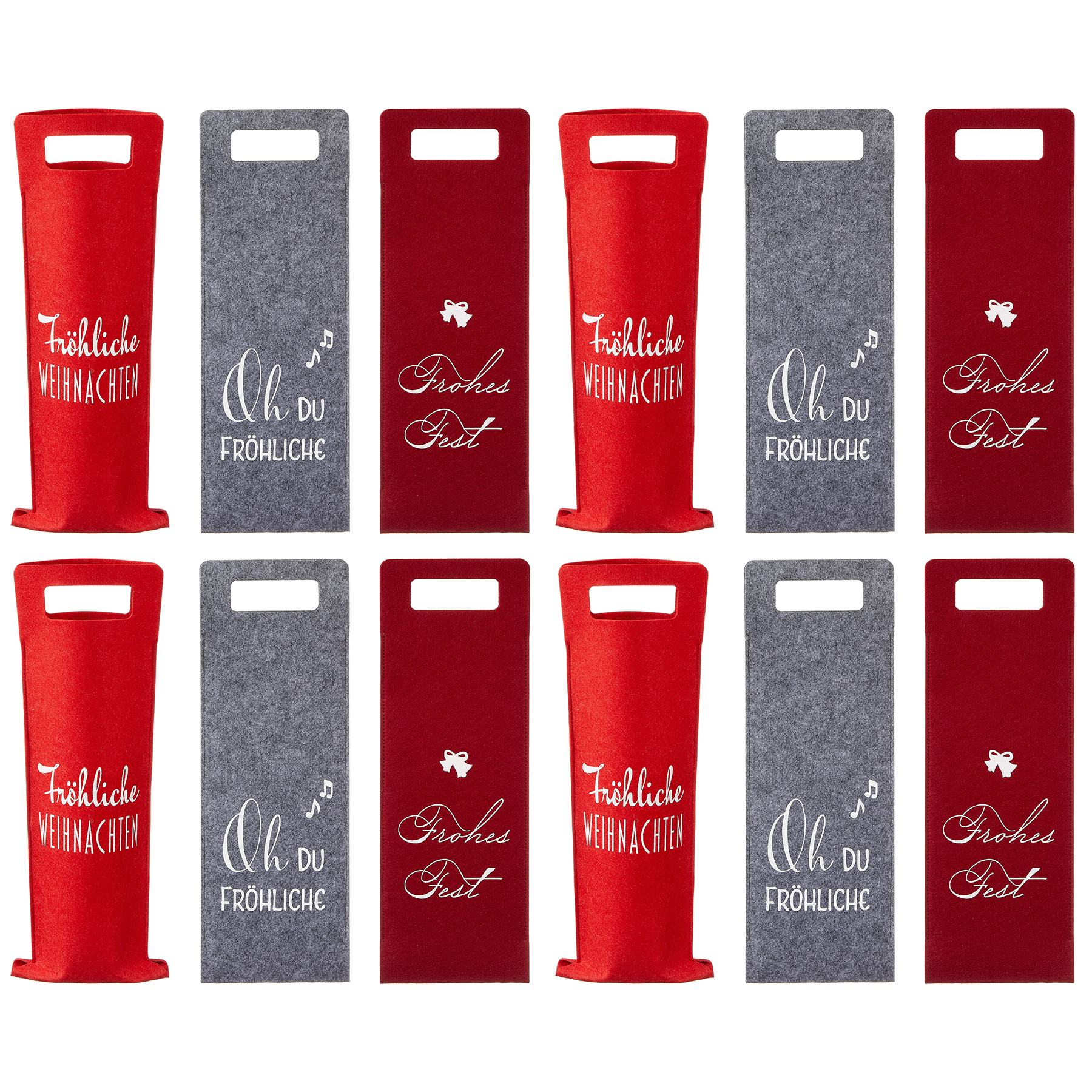 Stilvolle Flaschentüten aus Filz mit weihnachtlichem Aufdruck preiswert als 12er oder 6er Set. In Set sind drei Farben und drei Aufdrucke für Sie sortiert.