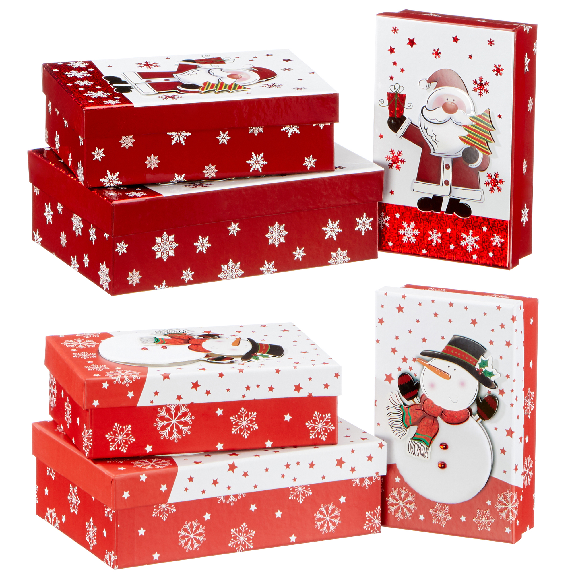 Liebevolle Geschenkboxen für Weihnachten mit niedlichem Nikolaus oder Schneemann in 3-D-Optik. Die süssen Karton sind klassisch in bordeaux und rot mit Schneeflocken bedruckt. Das Set der Weihnachtskartons besteht aus 3 Boxen.
